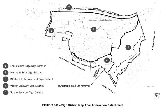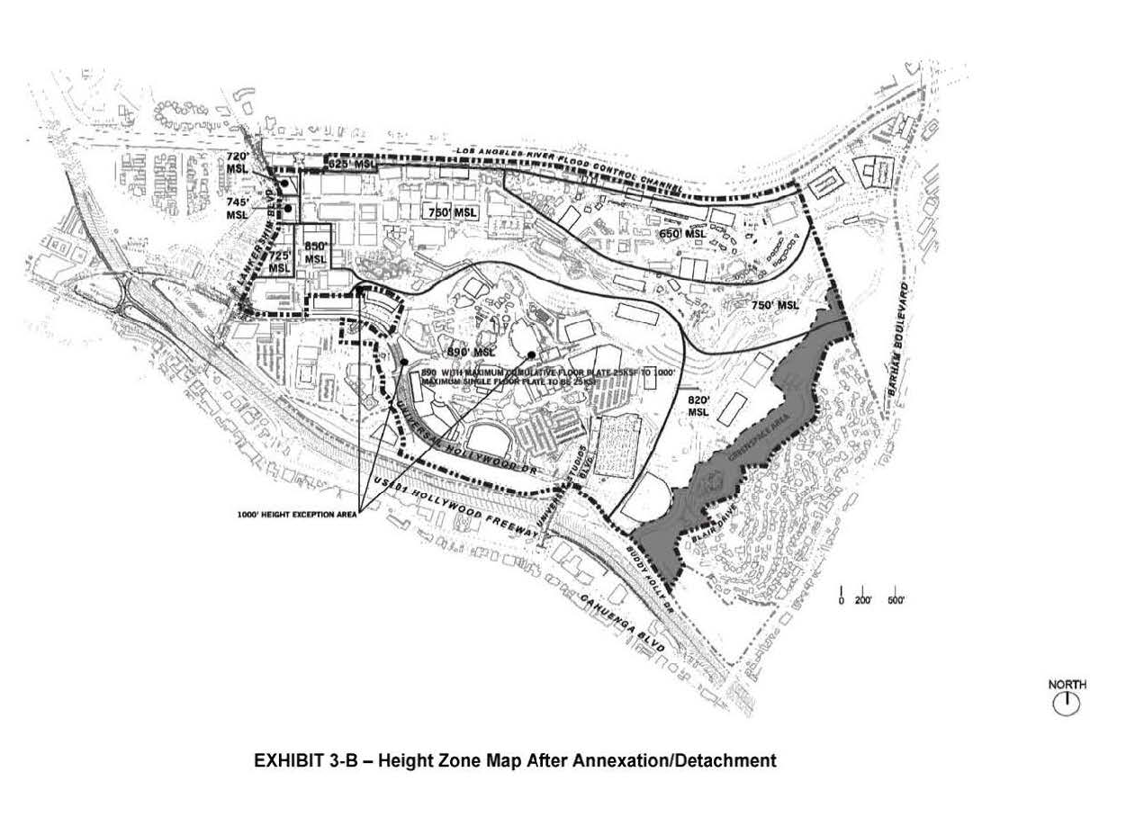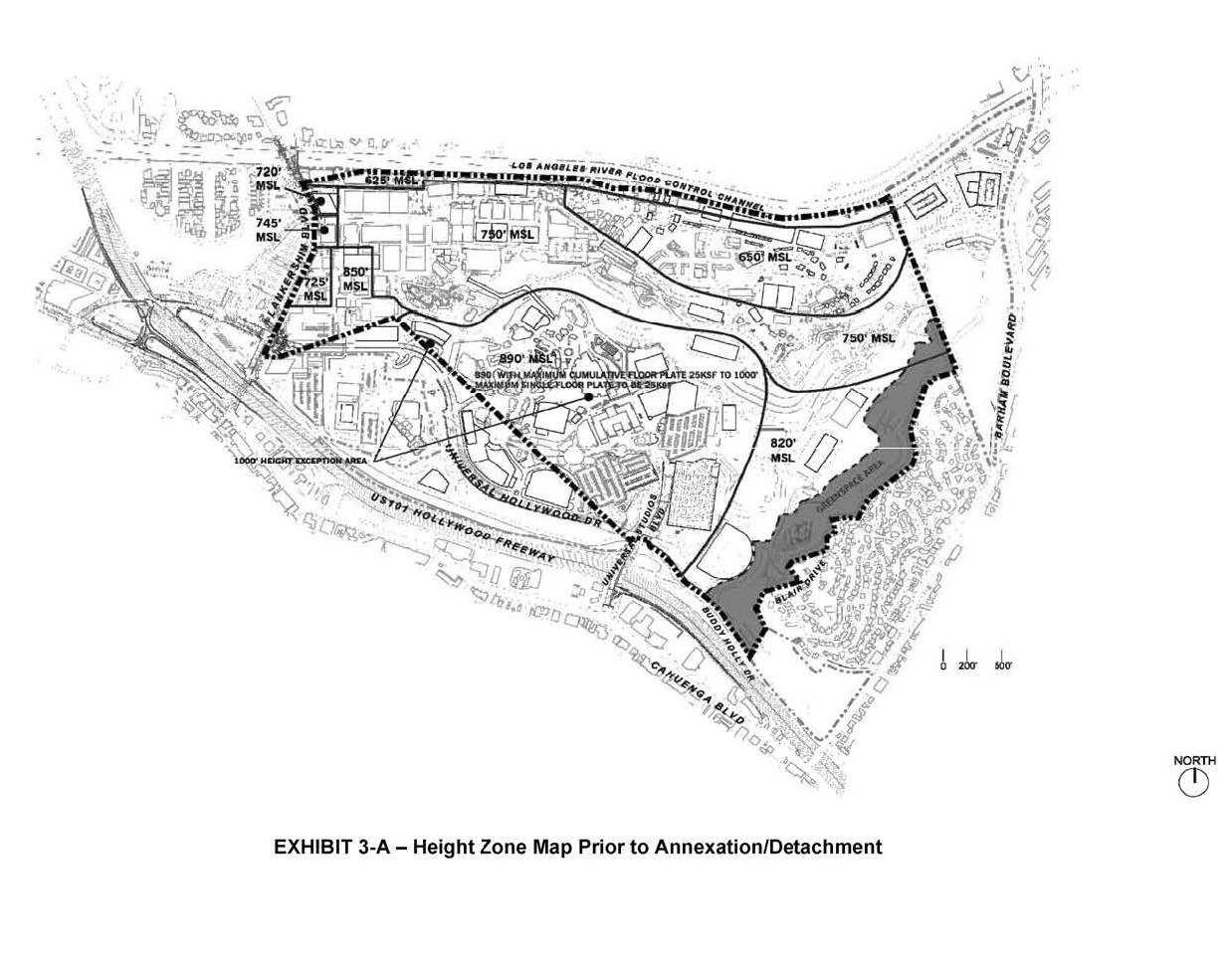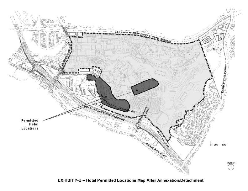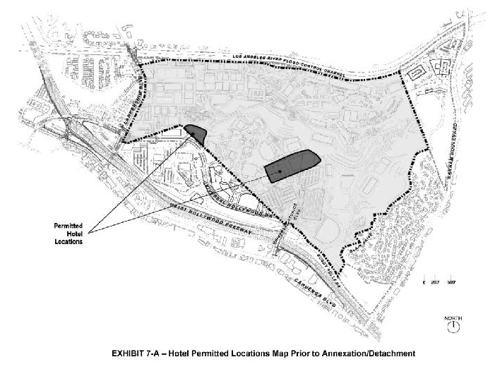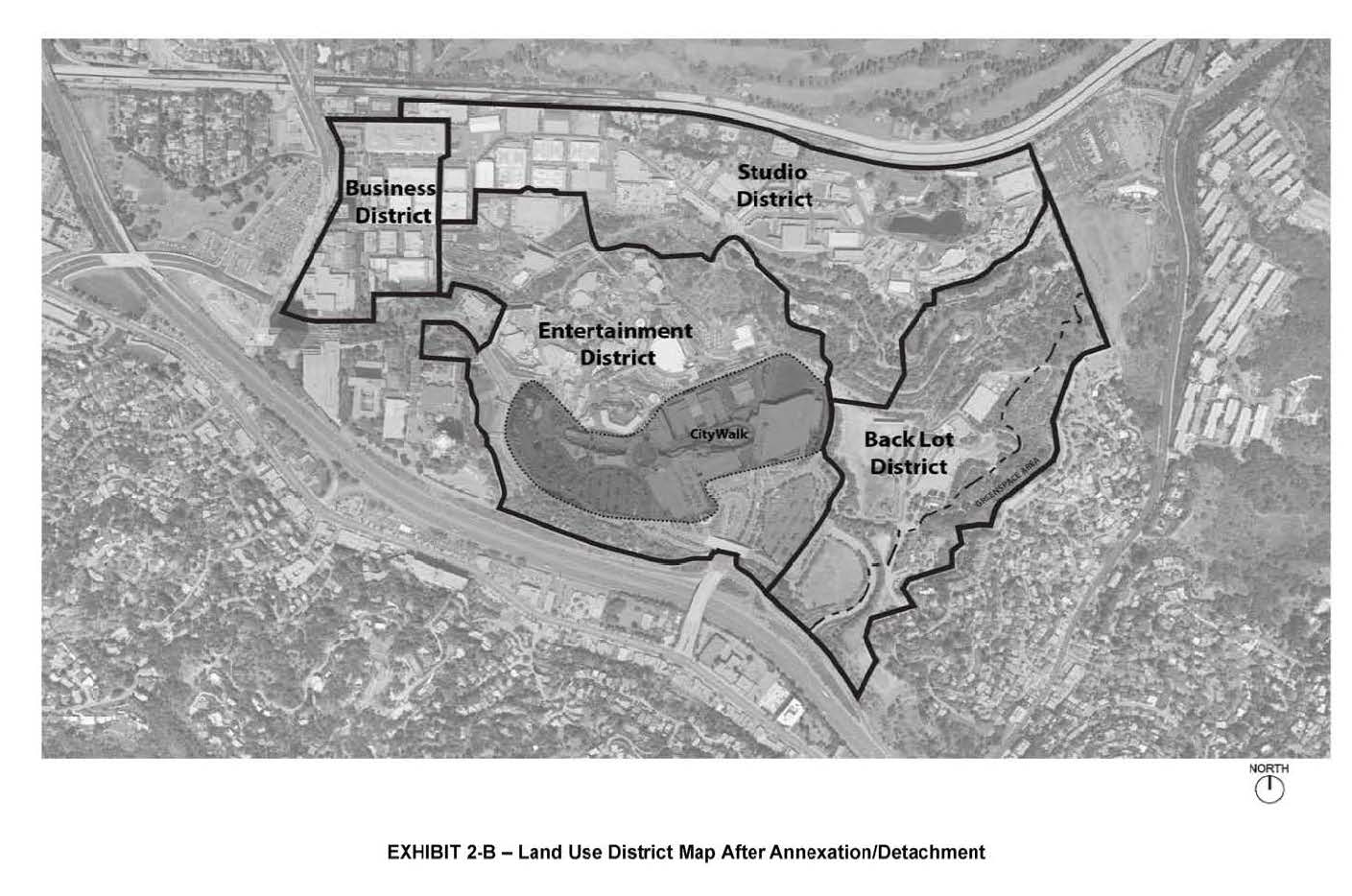 After the effective date of the Universal Studios Specific Plan, portions of the Universal Studios Specific Plan area, existing within the County as of the effective date of this Specific Plan, may be annexed into the City and areas of the NBC Universal properties within the City may be detached from the City and made part of the Universal Studios Specific Plan area, upon approval of the annexation and detachment actions by the Local Agency Formation Commission for the County of Los Angeles. If the proposed annexation and detachment actions are approved by the Local Agency Formation Commission, then the Universal Studios Specific Plan area shall encompass those areas shown within the heavy dashed lines on the Universal Studios Specific Plan Map shown on Exhibit 1-B on the effective date of the annexation and detachment actions. The legal description of the boundaries of the Universal Studios Specific Plan following the proposed annexation and detachment actions is set forth in the zone change ordinance (Ordinance No. 2013-0013Z). Those areas proposed to be detached from the City and returned to the jurisdiction of the County are shown on Exhibit 1-C. If the Local Agency Formation Commission modifies the areas of annexation and detachment shown on Exhibit 1-C, the Director is authorized to modify the exhibits and tables of this Specific Plan consistent with the Local Agency Formation Commission's action pursuant to Section 22.408.220 of this Specific Plan.