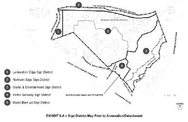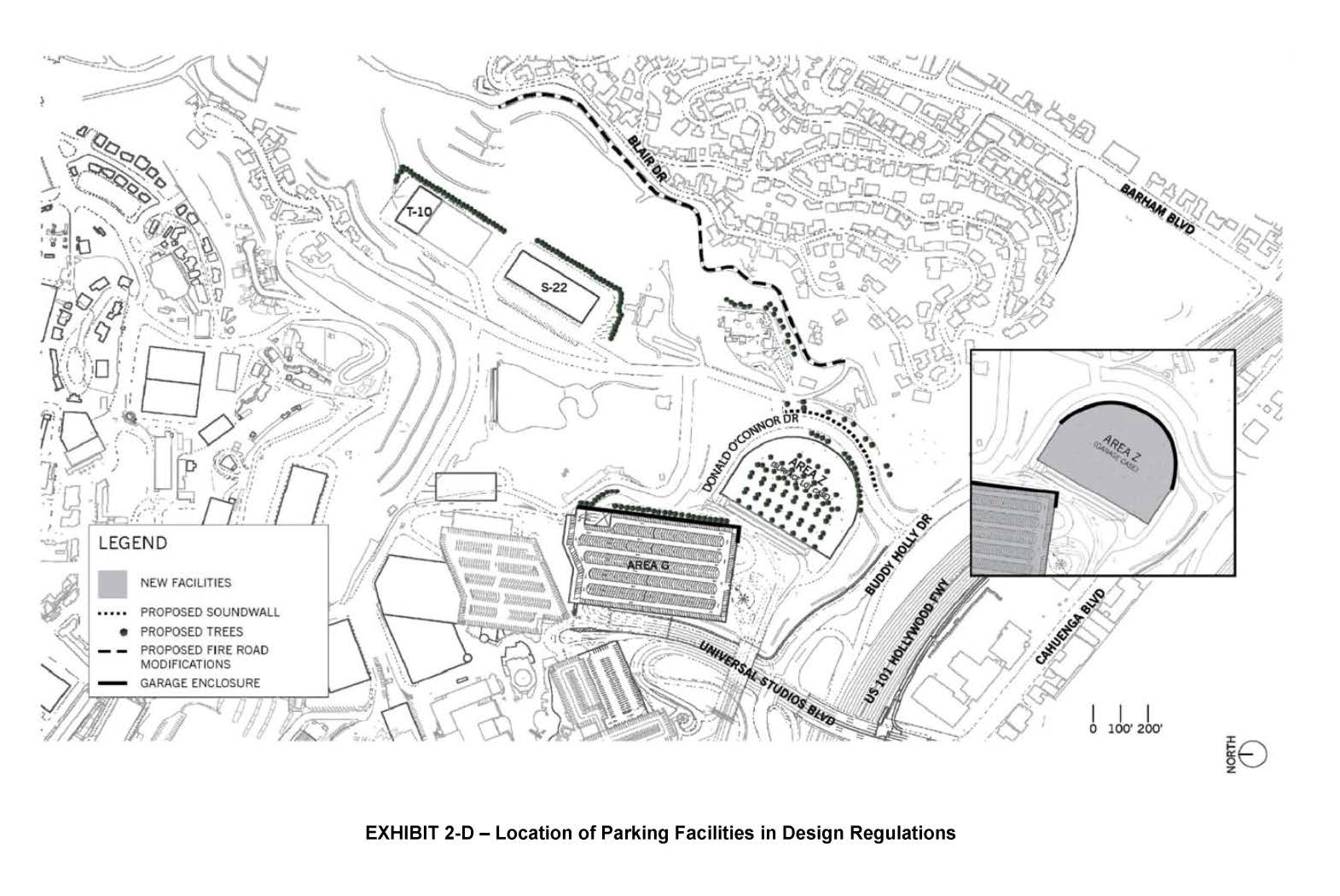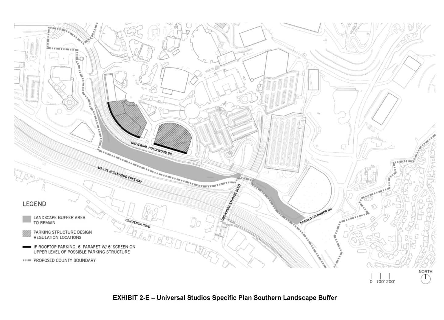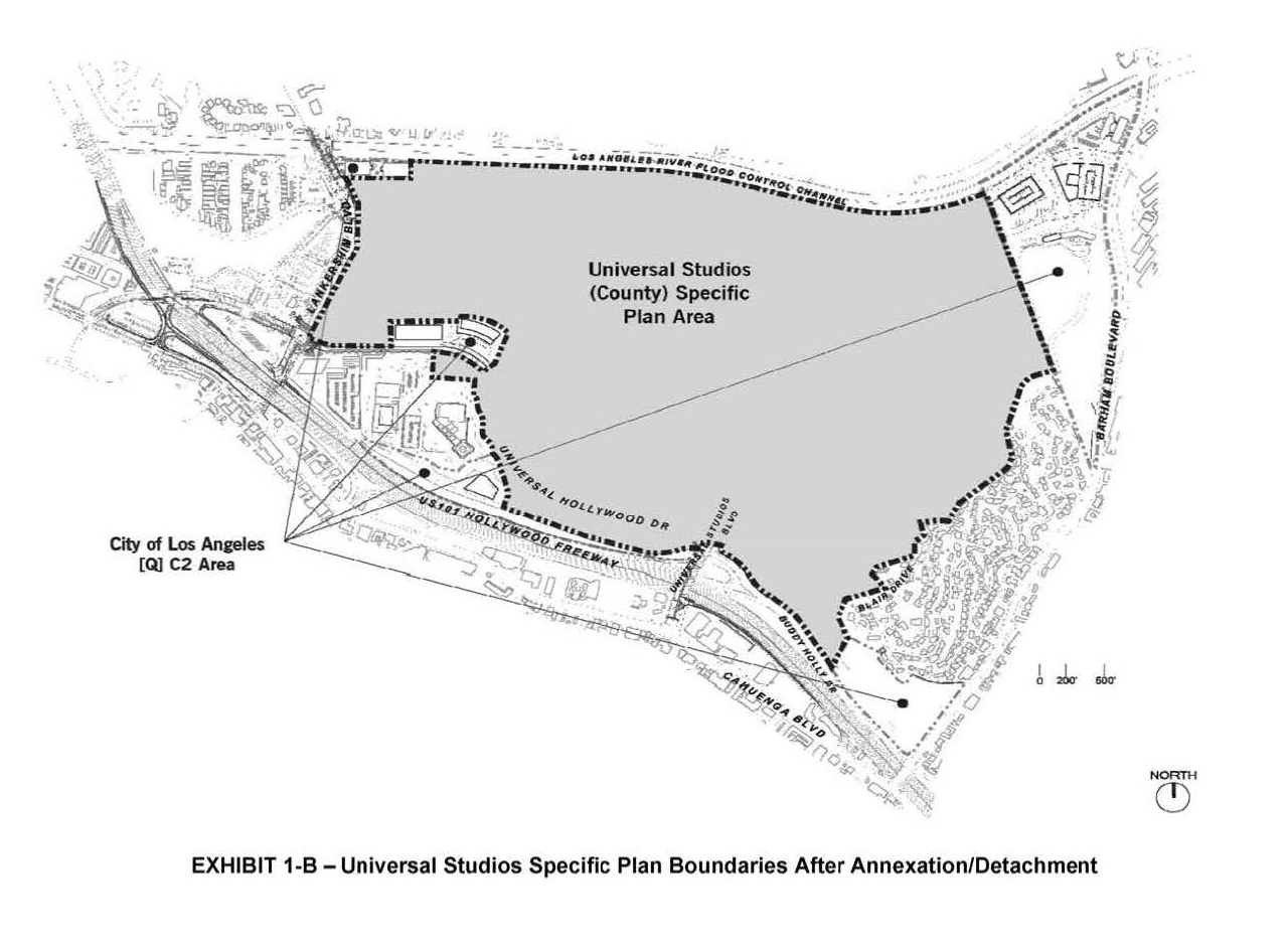 As of the effective date of this ordinance, the Board of Supervisors establishes the Universal Studios Specific Plan pursuant to Chapter 22.400 of Title 22 of the Los Angeles County Code (County Code), for the area generally bounded by the Los Angeles River Flood Control Channel road on the north, the adjacent NBC Universal property and existing residential properties within the City of Los Angeles to the east, the Hollywood Freeway to the south (except for the southwest corner of the area, which abuts hotel and office properties in the City of Los Angeles), and Lankershim Boulevard to the west, as shown upon Exhibit 1-A within the heavy dashed lines. The legal description of the boundaries of the Universal Studios Specific Plan is set forth in the zone change ordinance (Ordinance No. 2013-0013Z). The Specific Plan Guidelines provide guidance to the Department for the implementation of this Specific Plan and are available at Department in the case file.