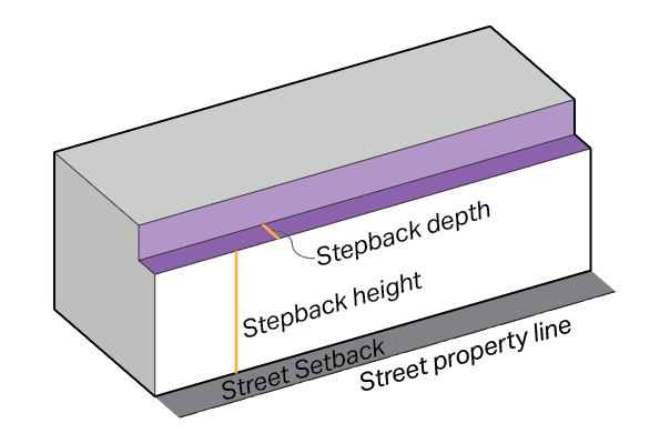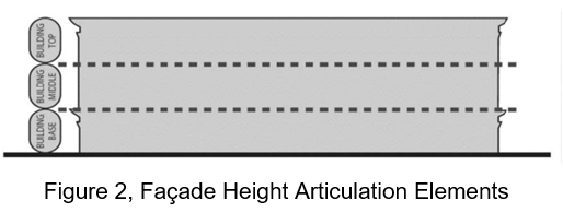 For building façade with street frontage, at least 30 percent of the façade above the first story shall consist of materials or designs different from the rest of the façade. Examples of such materials include recessed windows, balconies, offset planes, or similar architectural accents or features.