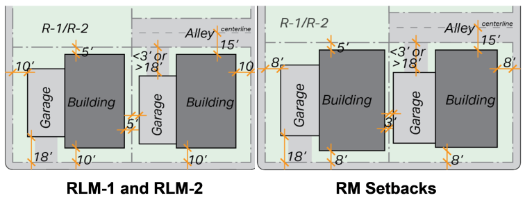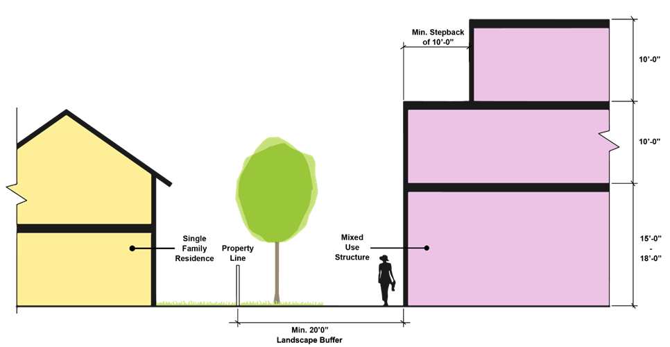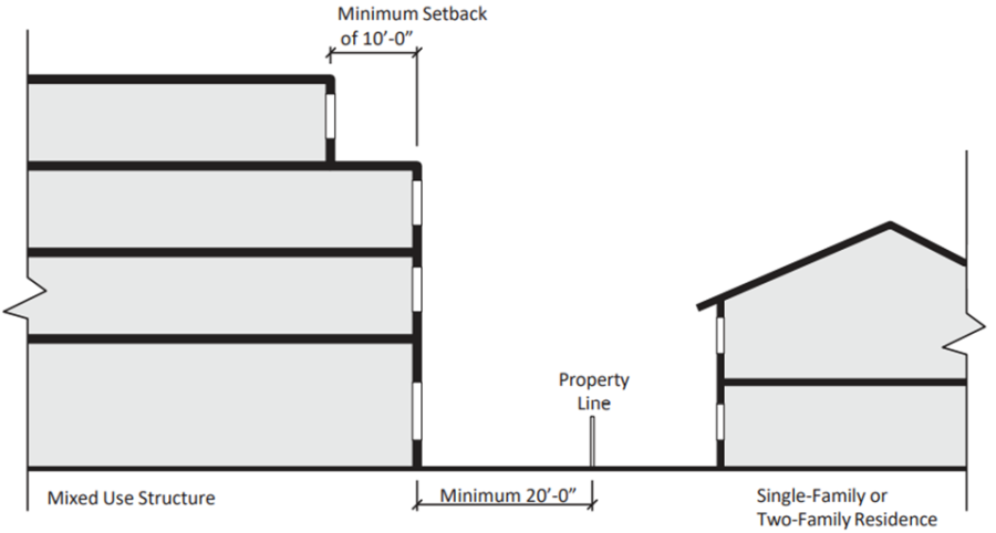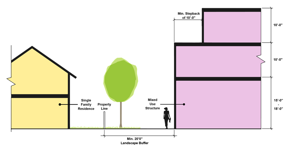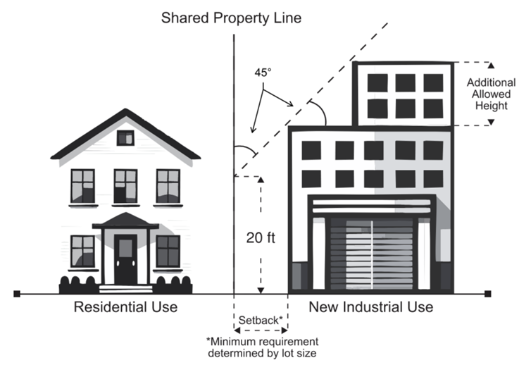 Setbacks. All new buildings and structures that face a Residential Zone or sensitive use shall have a minimum setback of 10 feet from the front property line. The setback shall be completely landscaped, except where there is required parking or a driveway.