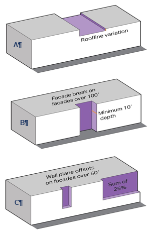 Variation of form and massing shall be used in building designs to provide visual interest. Long, unbroken façade are prohibited.