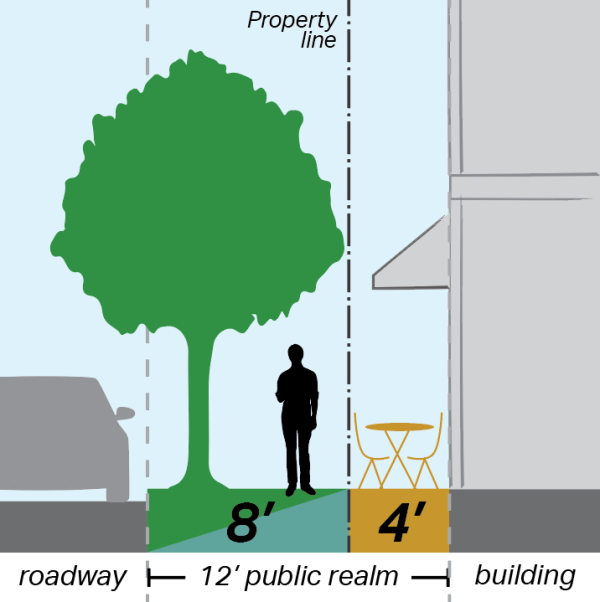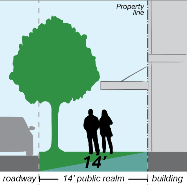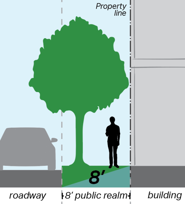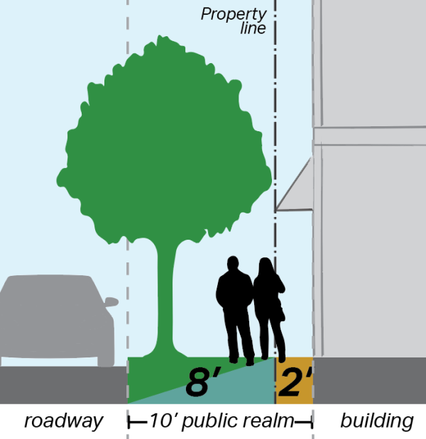 A minimum of 10 square feet of privately owned public space shall be provided for every foot of lot frontage. The public space shall be provided on-site, along and directly accessible to pedestrians from a commercial corridor, or where a commercial corridor is not present, a street. Said privately owned public space shall be maintained by the property owner in the manner depicted in submitted maintenance, lighting, landscaping, and site plans.
