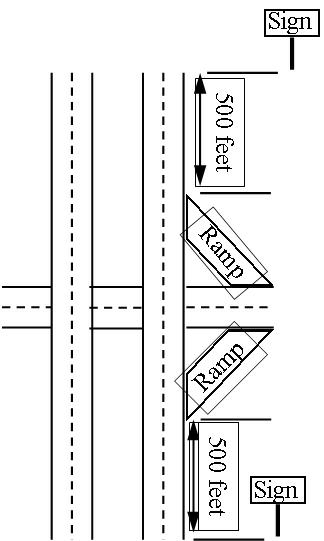 Off-premises advertising (billboard) signs shall not be located less than 500 feet from any interstate highway access/exit ramp or safety rest area measured along the Interstate roadway from the beginning or ending of pavement widening at the exit from or entrance to the main traveled way. (Refer to Figure 6.5.)