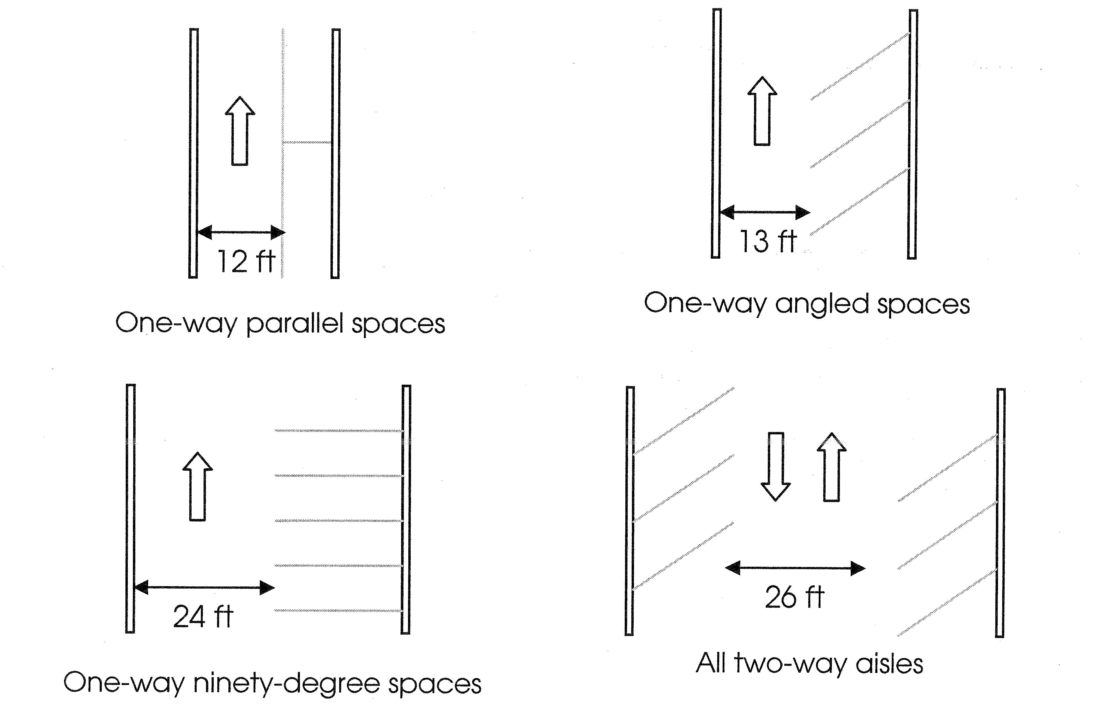 A parking space is the storage space of one (1) automobile. Parking space size shall be in accordance with Section 7.2.1, parking space dimensions. Parking aisle width must be in accordance to Figure 7.1, Aisle Widths. All two-way parking aisles must be twenty-six (26) feet wide. One-way parking aisles can range from twelve (12) feet to twenty-four (24) feet wide, depending on the angle of the parking space.