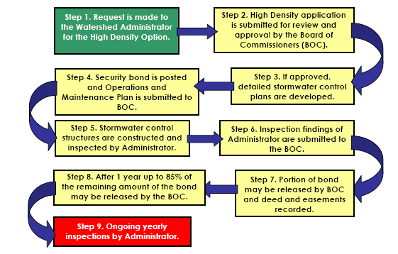 A development permit shall not be issued for any building within the permitted development until the Board of Commissioners has approved the stormwater control structure, as provided in Step 7.