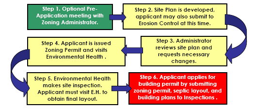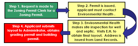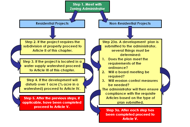 The flow chart below gives an overview of the process that must be followed to obtain a Zoning Permit for new residential construction. This generally includes single and two family development that does not require the submittal of a non-residential site plan, as described earlier in this chapter. The steps below correspond to the detailed steps that are found on the following pages.