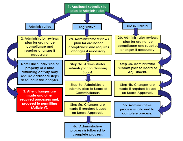 There are several types of non-residential development plans. These plans are generally differentiated by the type of review that is required for approval. The following is a list of the types of plan approval based on their review and a chart showing the steps to achieve: