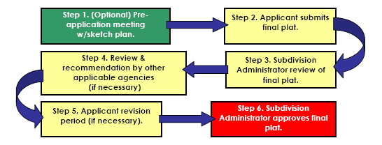 A subdivider may apply to the Subdivision Administrator for a plat review process for minor and special subdivisions. The steps in the following chart correspond with a detailed description of each step of the process on the following pages.