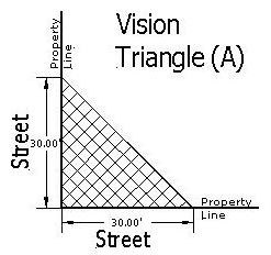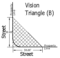 Vision triangle means the area created by drawing an imaginary line between points 30 feet back from where the property lines meet at two intersecting streets (vision triangle A). A vision triangle shall also be required where two perpendicular property lines do not form an intersecting angle. In this case, the projection of such property lines will be extended to a point of intersection, thereby, creating the vision triangle (vision triangle B).