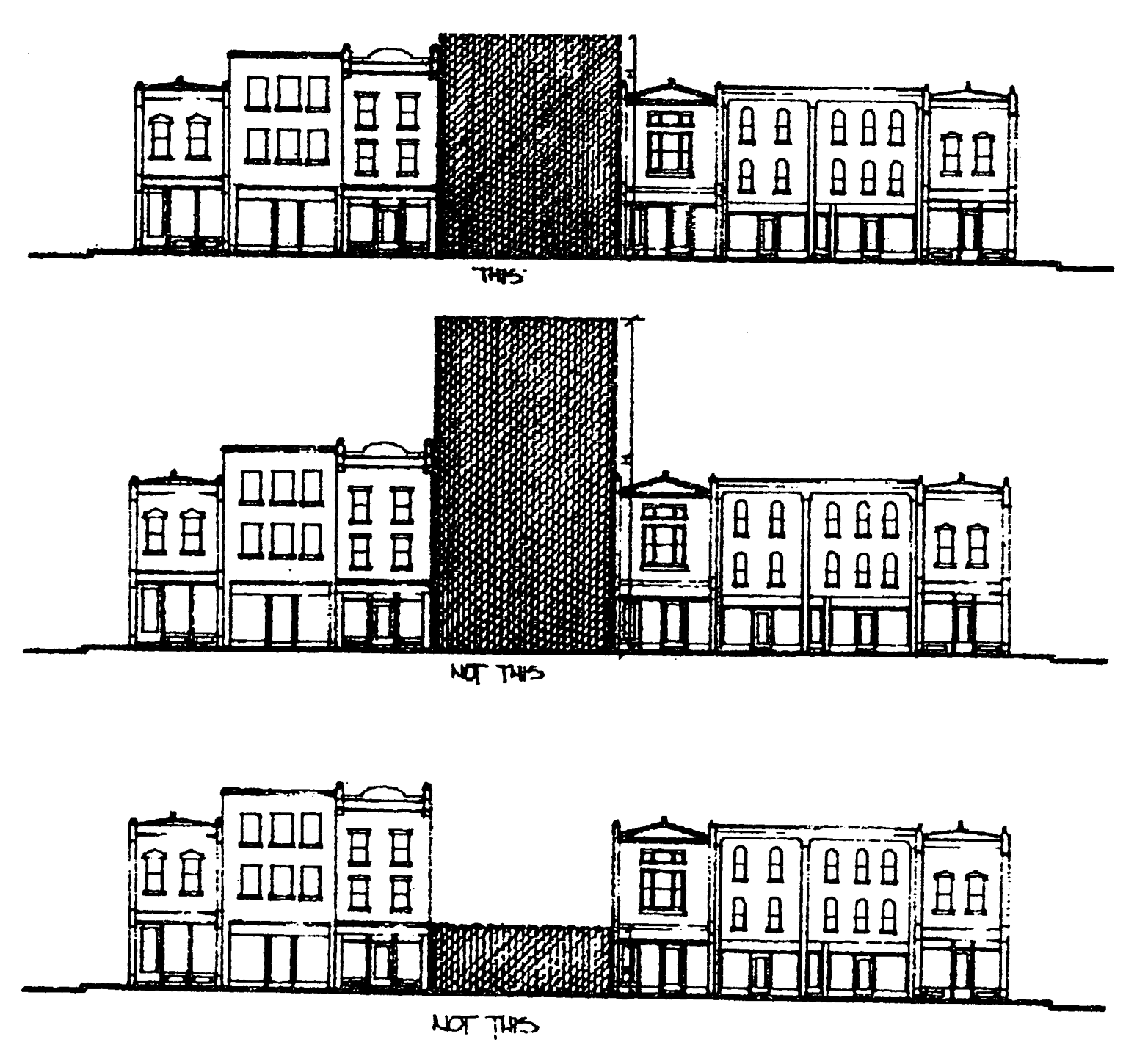 Height and roofline. Varied roofline elevations are required to add architectural interest and avoid the appearance of long, monotonous roofline expanses. A variation such as a parapet or tower is required every 50 feet of roofline. Also, mechanical equipment mounted on the roof must be screened from ground-level view and the back of parapets must match the color and materials of the building.