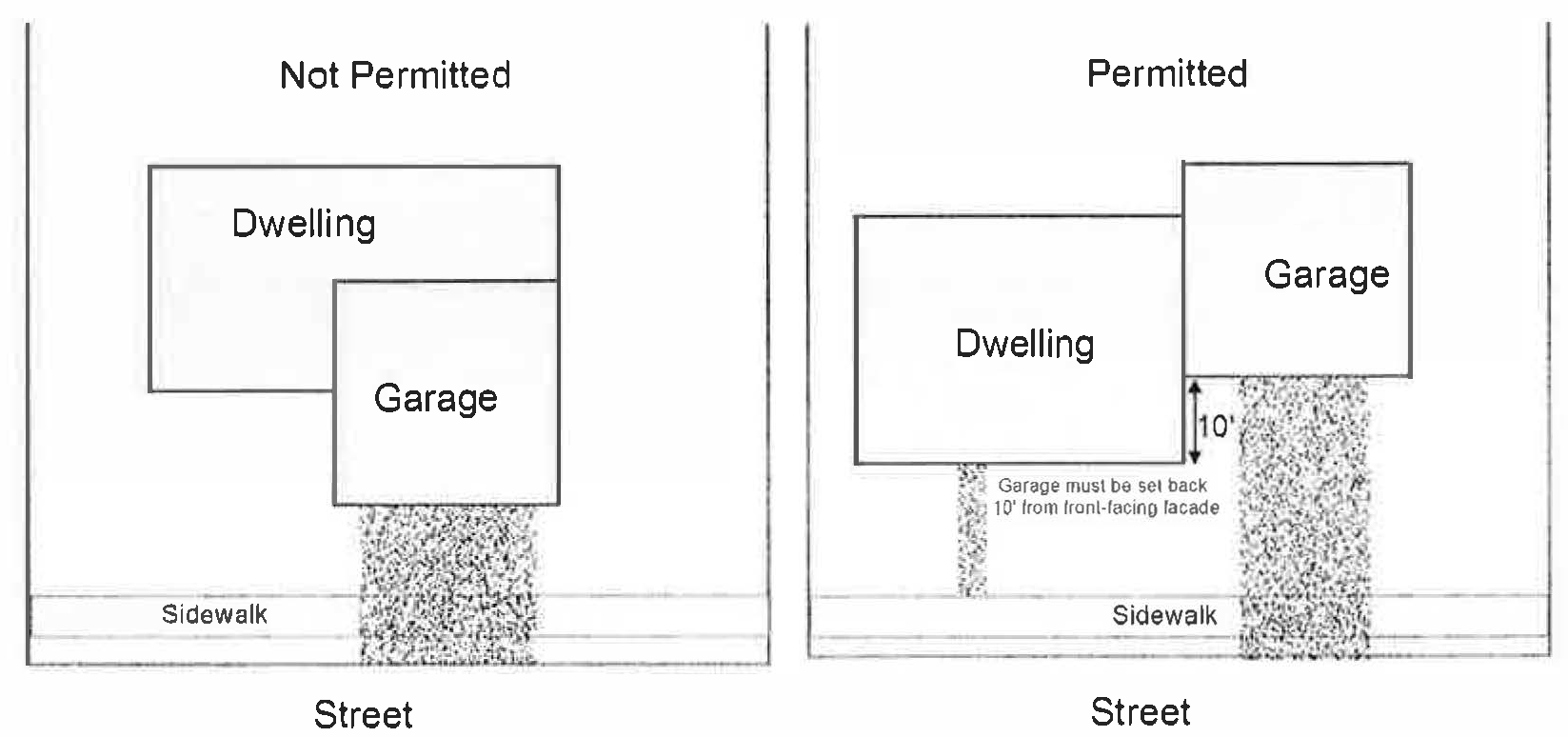 If an attached garage is proposed, such garage shall be offset such that it is set back at least ten (10) feet from the front-facing building façade.
