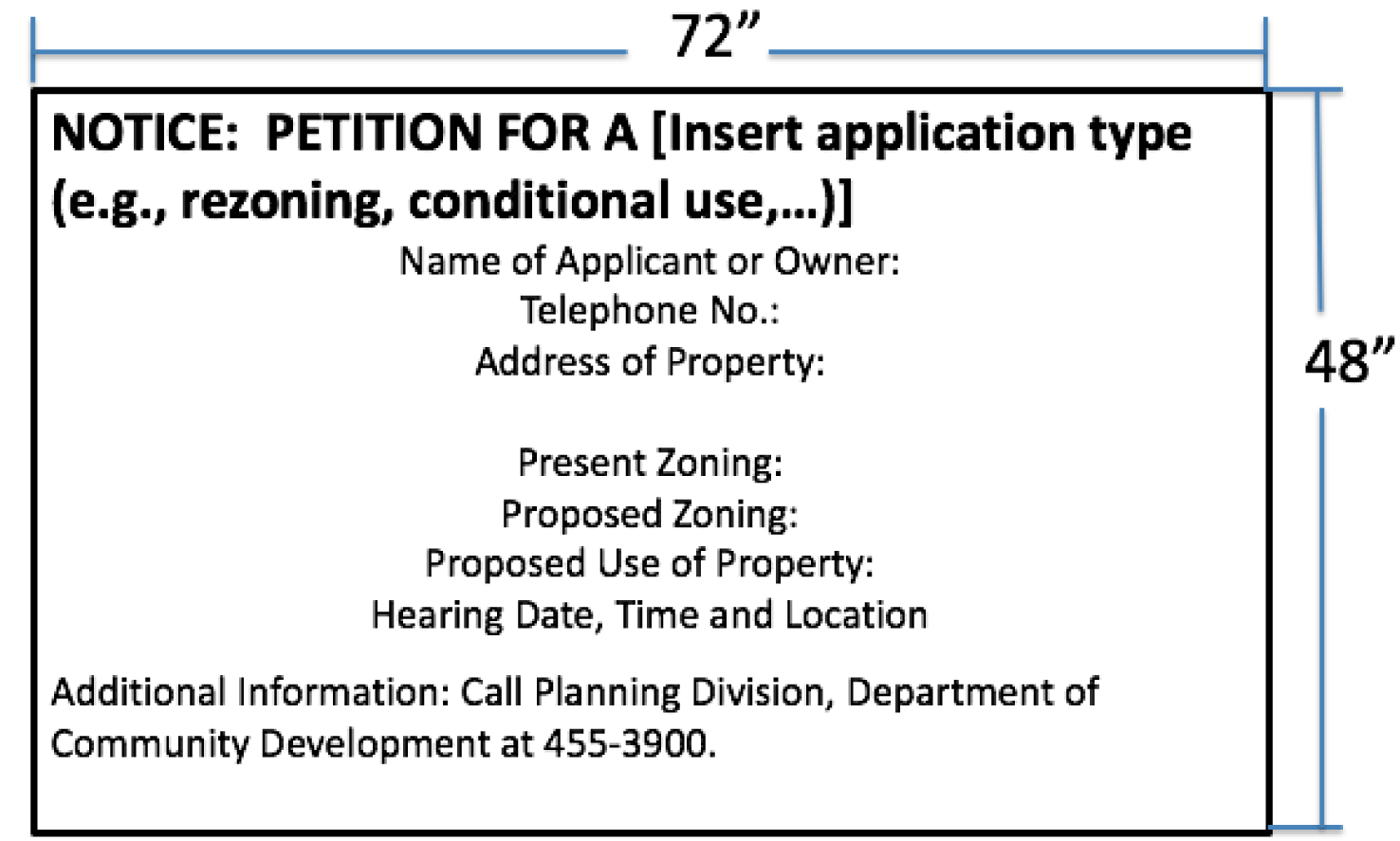 Format of Notification Signs. Signs shall be of wood or metal, at least 48 inches by 72 inches in size and the lettering thereon shall be black letters on a white background measuring at least three inches in height. The applicant shall notify the Division of Planning in writing that the sign has been erected and where located (see sign format in Exhibit II-3).