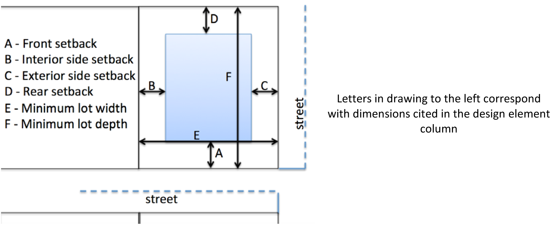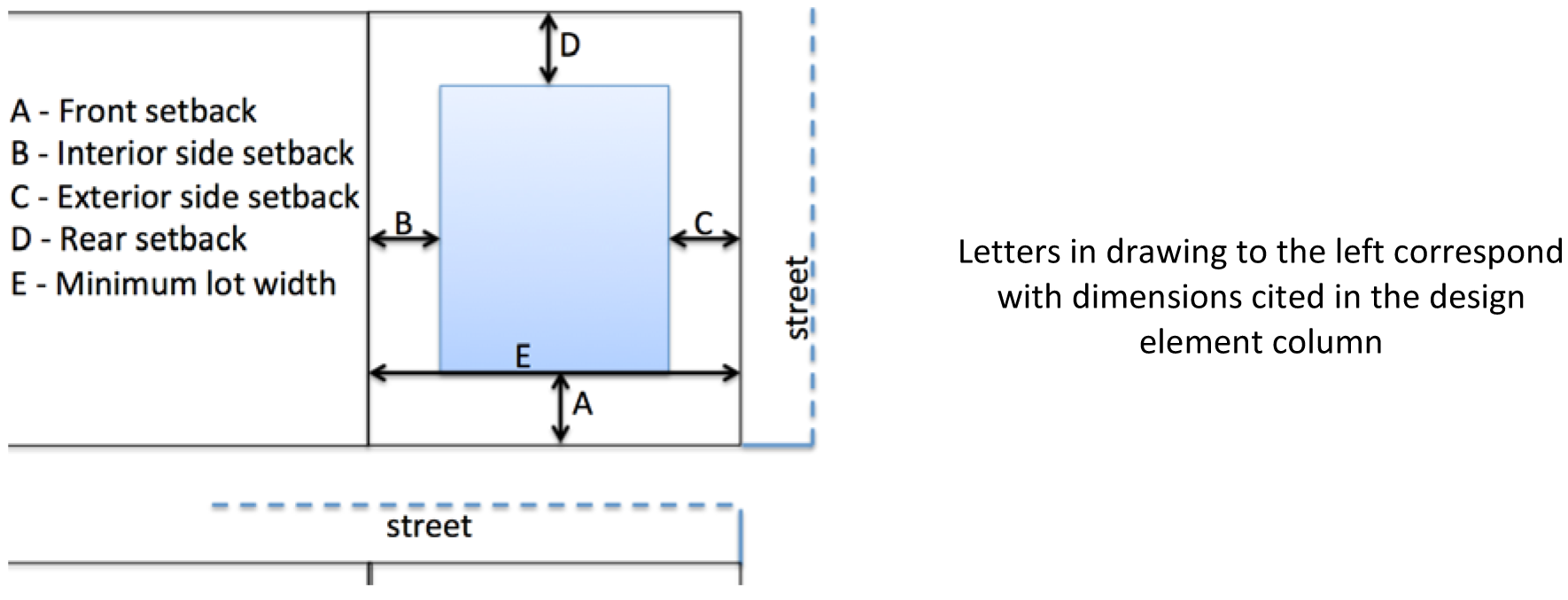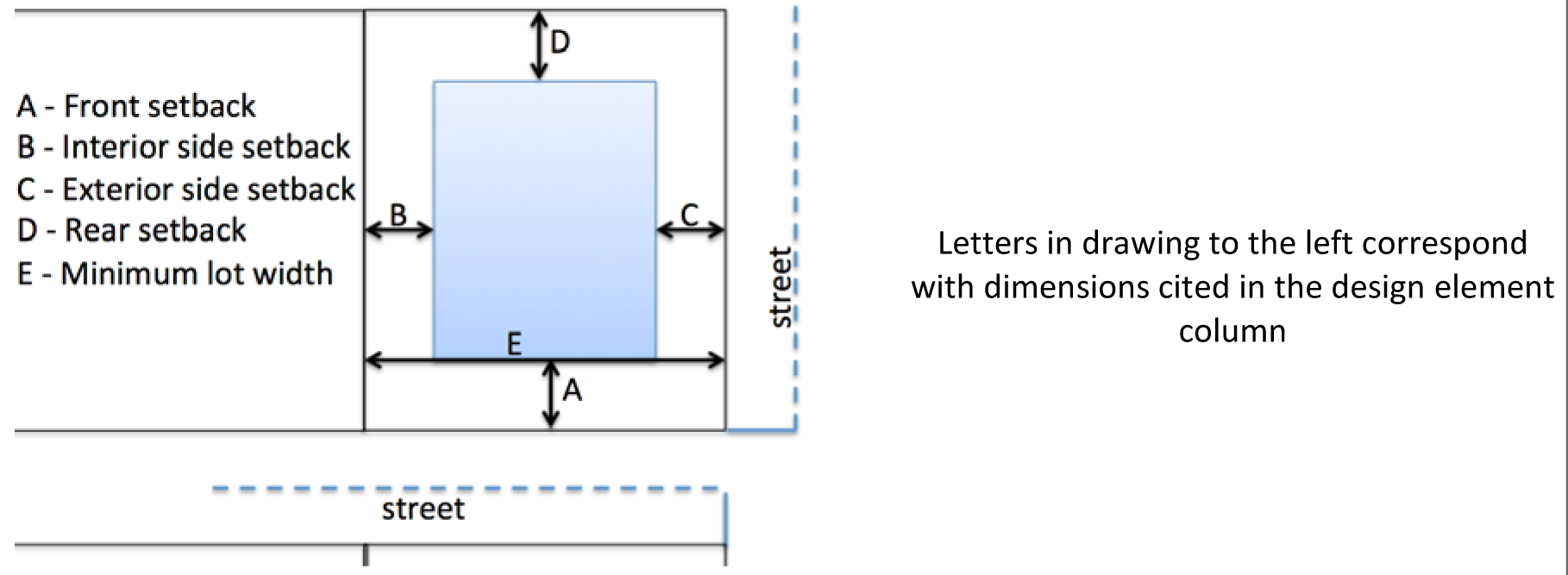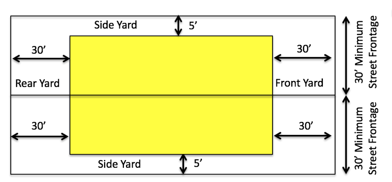Semi-detached or Detached Dwellings. For semi-detached or detached dwellings, the minimum lot area shall be 4,000 square feet and the minimum lot width shall be 30 feet. The minimum side setback shall be five feet except that there is no minimum side setback required along the party wall between adjoining units (see illustration below). Semi-detached or detached dwellings located on lots less than 8,000 square feet are not permitted accessory units.