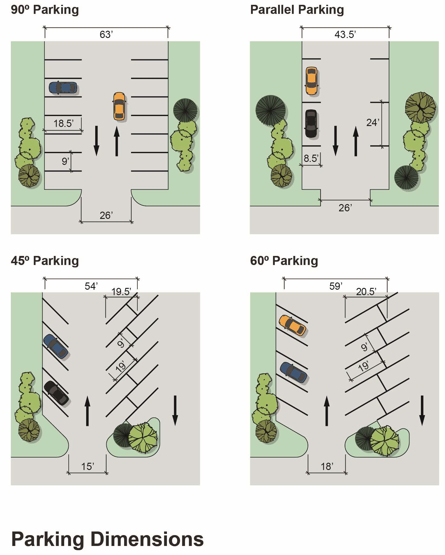 *Dimensions shall apply to all parking spaces, including accessible parking spaces. should state or federal regulations require larger dimensions, spaces shall be designed to achieve the larger minimum.