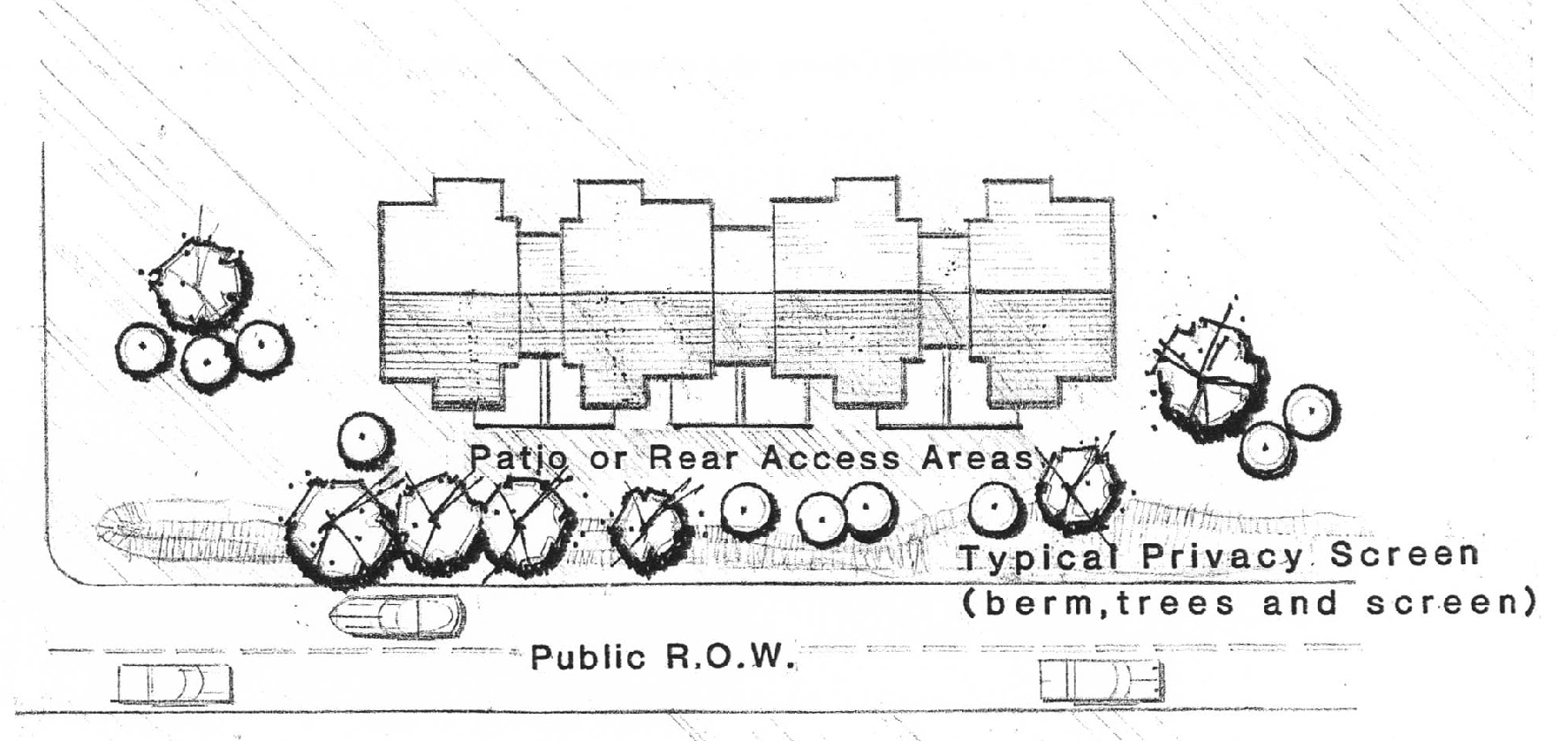 Privacy screen. Where multiple-family dwellings are designed so that rear open areas or patio areas front onto a public street, a landscaped privacy screen shall be provided (see illustration). The screen may consist of a combination of trees, shrubs, and berming, subject to review by the planning commission.