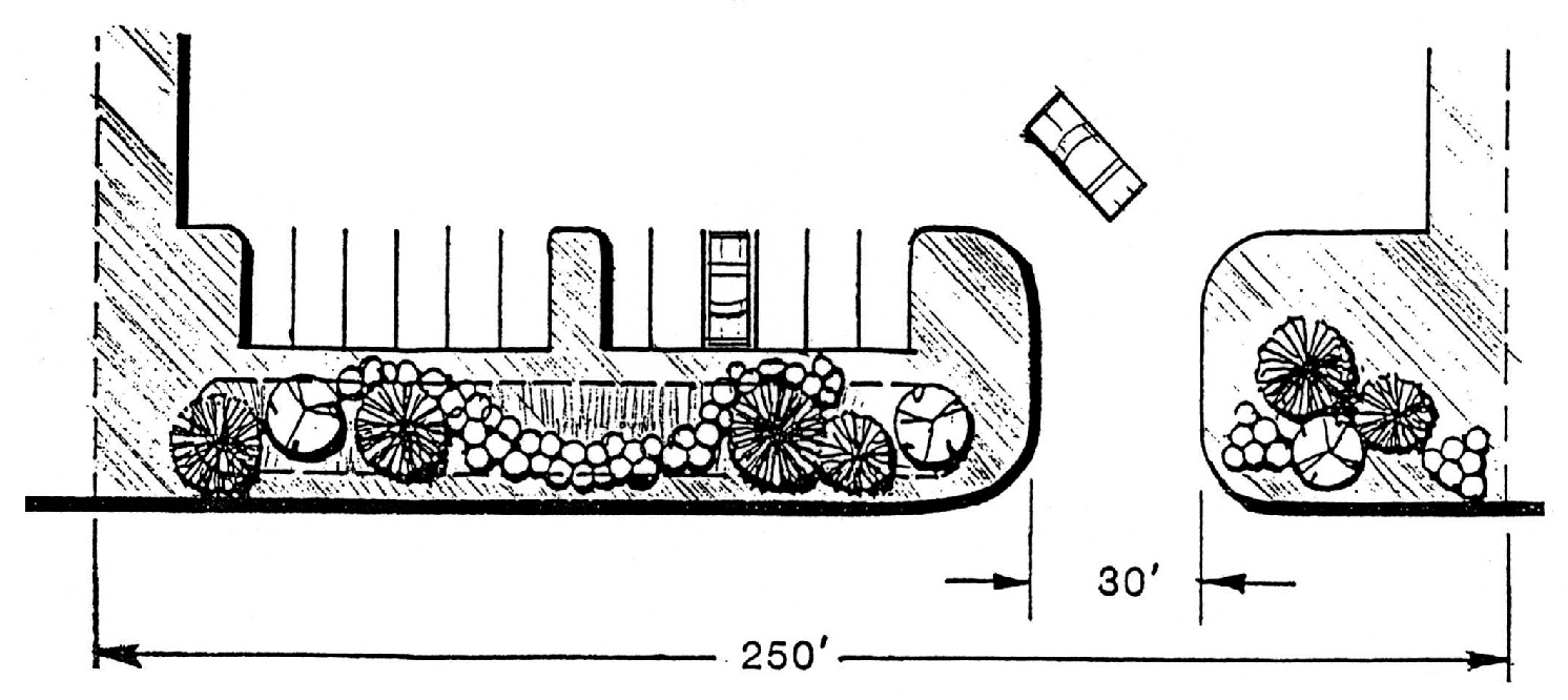 For the purposes of computing length of road frontage, openings for driveways and sidewalks shall not be counted. Trees and shrubs may be planted at uniform intervals, at random, or in groupings.
