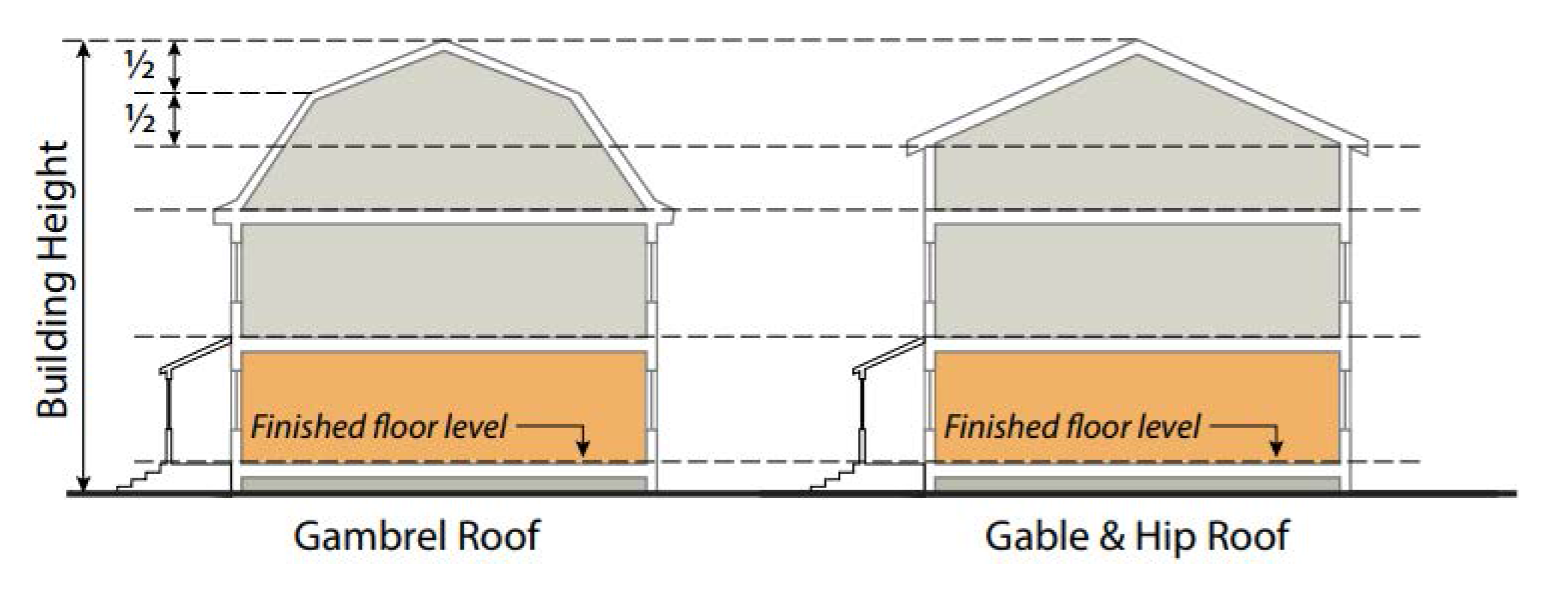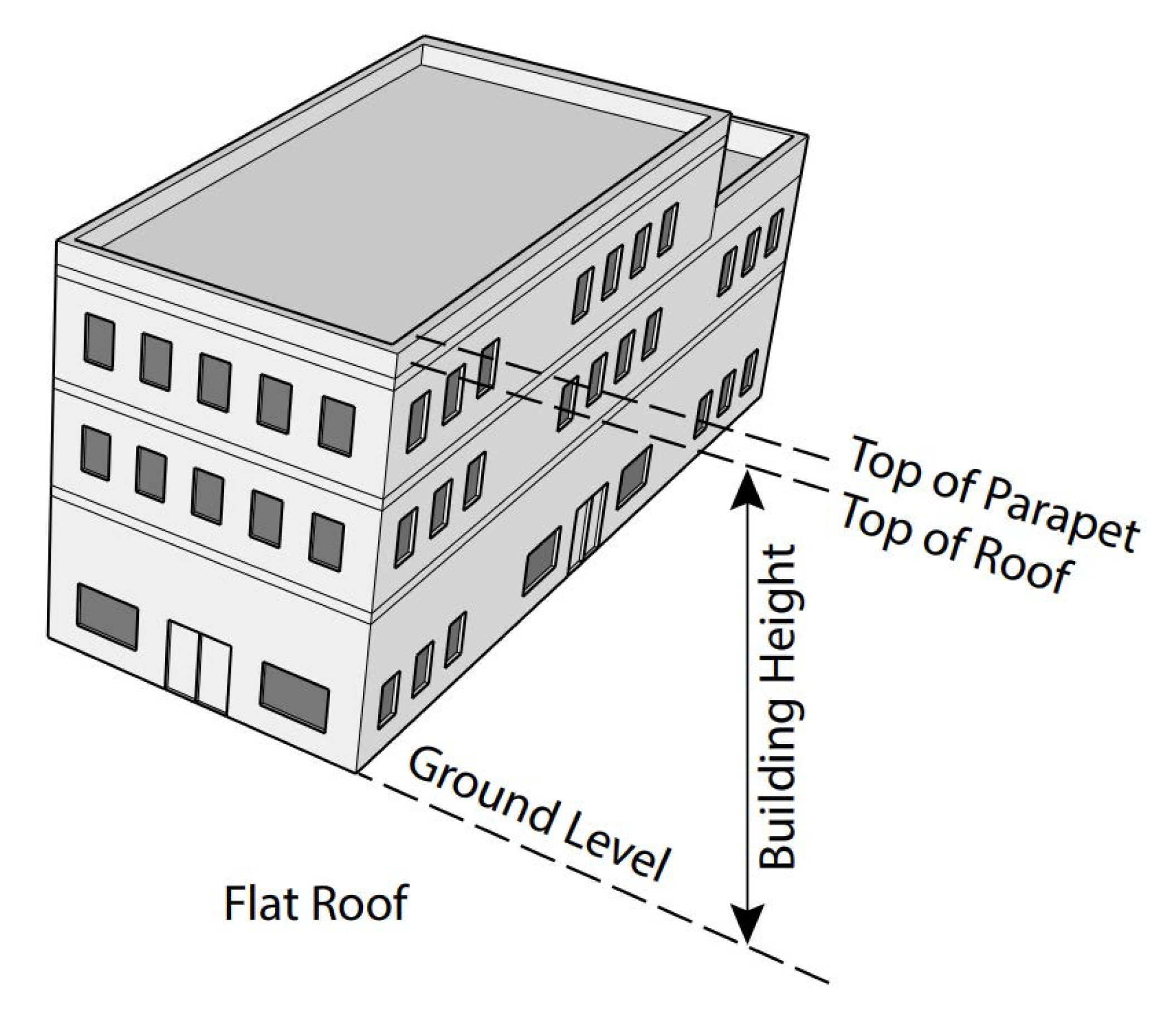 Building Height.The vertical distance measured from the ground level adjoining the building to the highest point of the roof surface if a flat roof, to the deck line of mansard roofs, and to mean height level between eaves and ridge of gable, hip and gambrel roofs.