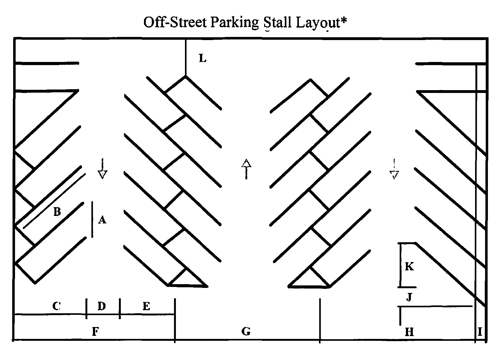 Parking layout for eight-foot parking stalls, at various angles, are shown in Table 2.