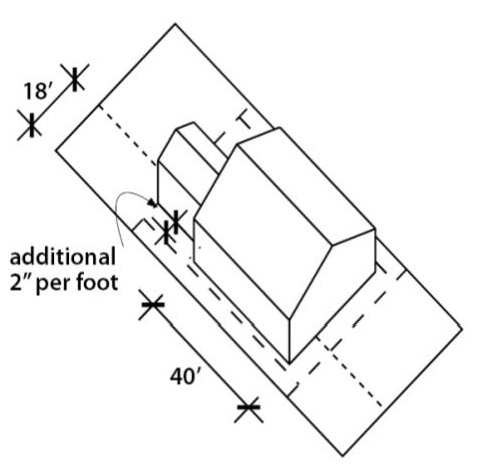 A maximum of forty (40) feet of a principal building's side wall may be placed at the minimum sidewall setback. In order to avoid the monotonous appearance of long unbroken building facades from streets or abutting properties, any portion of a building side wall located within eighteen (18) feet of the side lot line that exceeds forty (40) feet in depth shall be set back an additional two (2) inches from the side lot line for every foot over forty (40) feet in depth. This requirement applies to all new construction with the following exceptions: