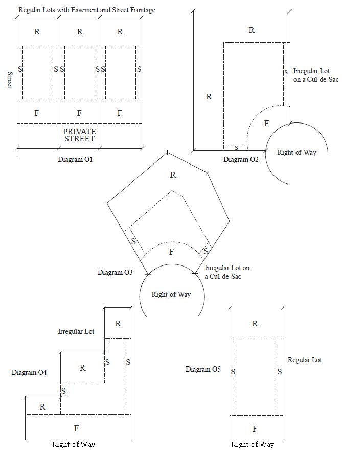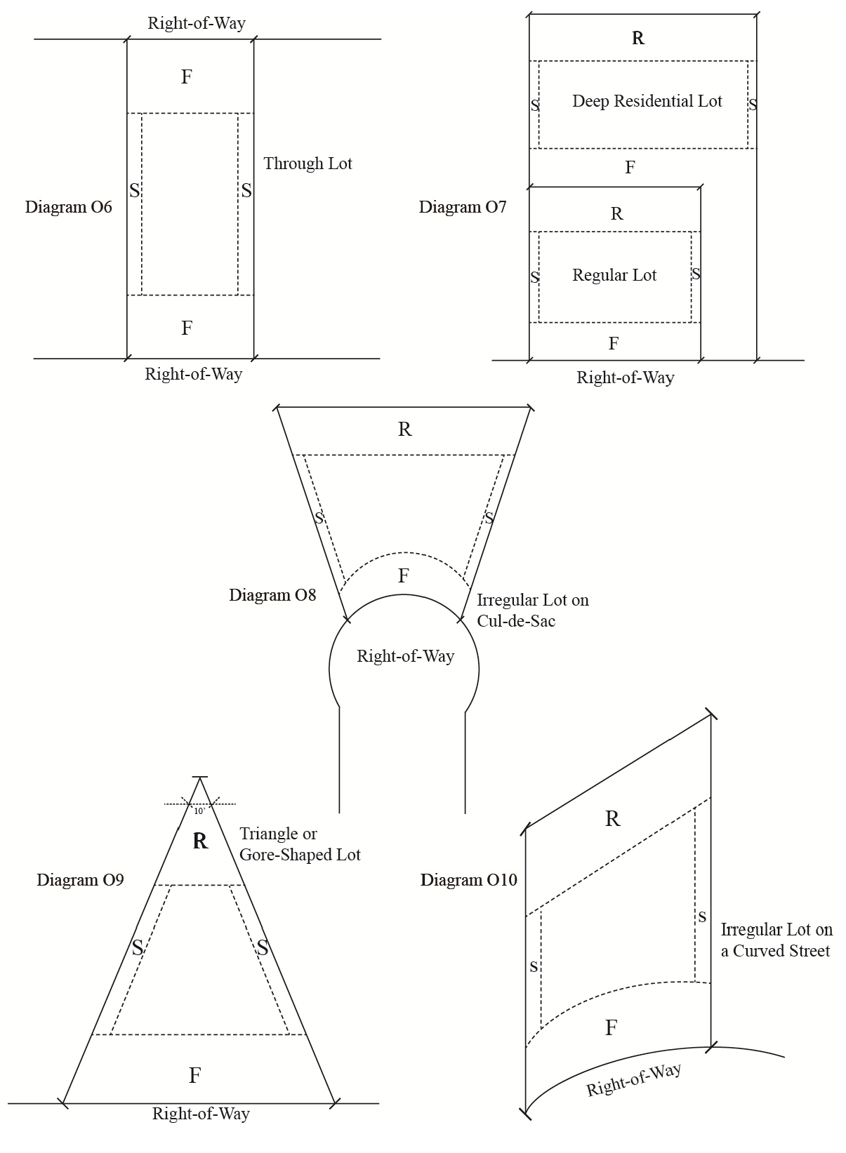 Setback (Maximum or Minimum), Rear Yard. The maximum or minimum distance by which any building or structure may be separated from the rear lot line. In the case of a triangular or gore-shaped lot, a line ten (10) feet in length entirely within the lot, parallel to and most distant from the front lot line shall be considered to be the rear lot line for the purpose of determining the rear yard setback. In the case of an irregular lot, the Zoning Administrator shall select a line or lines generally opposite the front lot line for the purpose of providing a rear yard area across and within the entirety of the lot as generally shown in the diagrams below. (Am. by ORD-17-00035, 3-29-17)