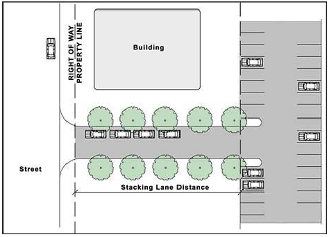 The design of the parking lot shall be based on a definite and logical system of drive lanes to serve the parking and loading spaces. A physical separation or barrier, such as vertical curbs, may be required to separate parking spaces from travel lanes.