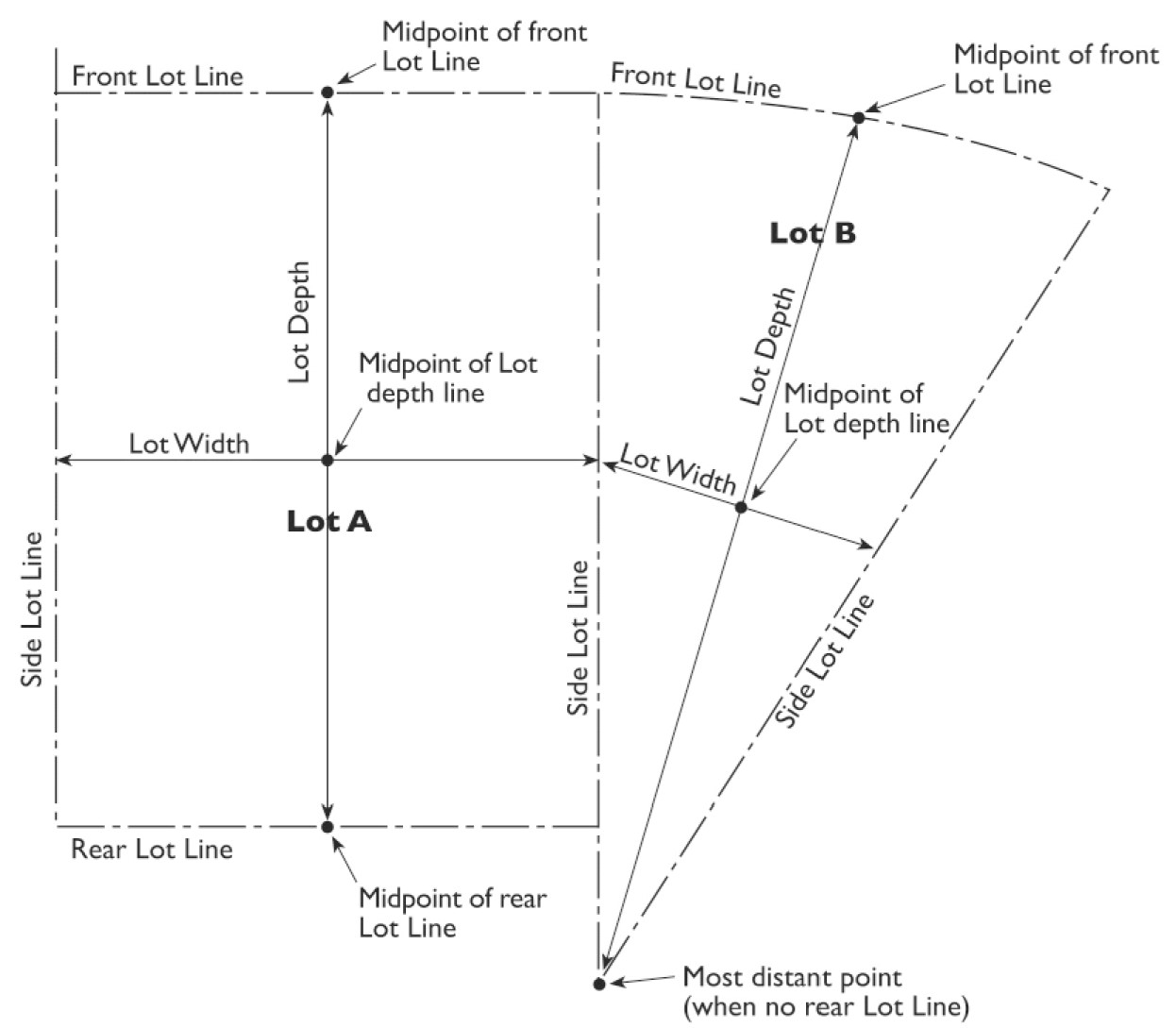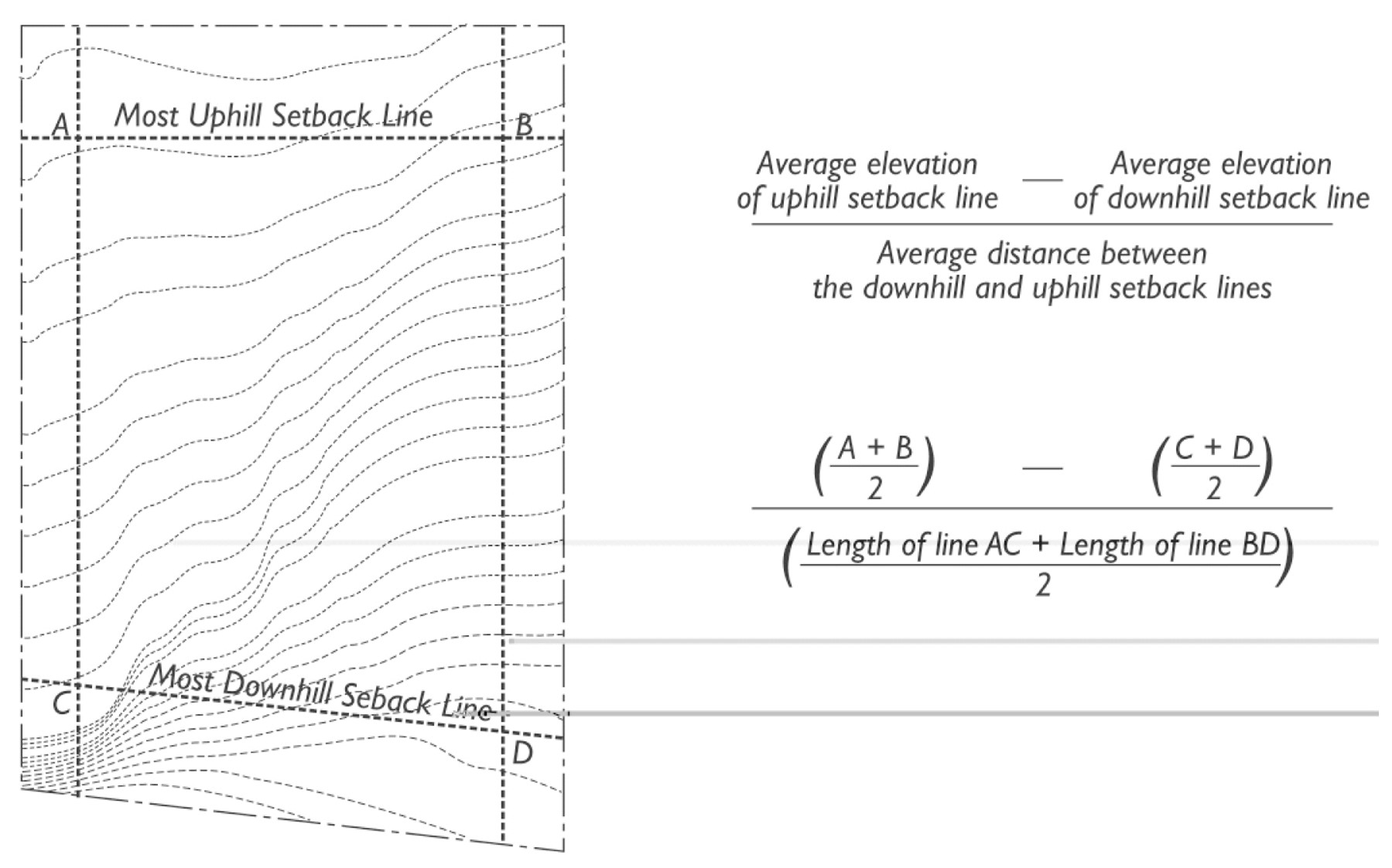 Calculating average slope means lot slope is calculated as an average slope of the ground area within the required setback lines (buildable area) for primary structures on a site. Lot slope is based on existing grade. The elevations of the points where required setback lines intersect are used to determine the average elevation of each setback line. Specifically, the average elevation of each setback line is calculated by adding the elevations at the line's intersection points and dividing by two. The average lot slope is then calculated by subtracting the average elevation of the most uphill setback line and the average elevation of the most downhill setback line and dividing the sum by the average distance between these two setback lines. Where required setback lines do not intersect to form a four-sided polygon, average lot slope shall be calculated by dividing the difference between the elevations of the highest and lowest points within the buildable area by the horizontal distance between said points.