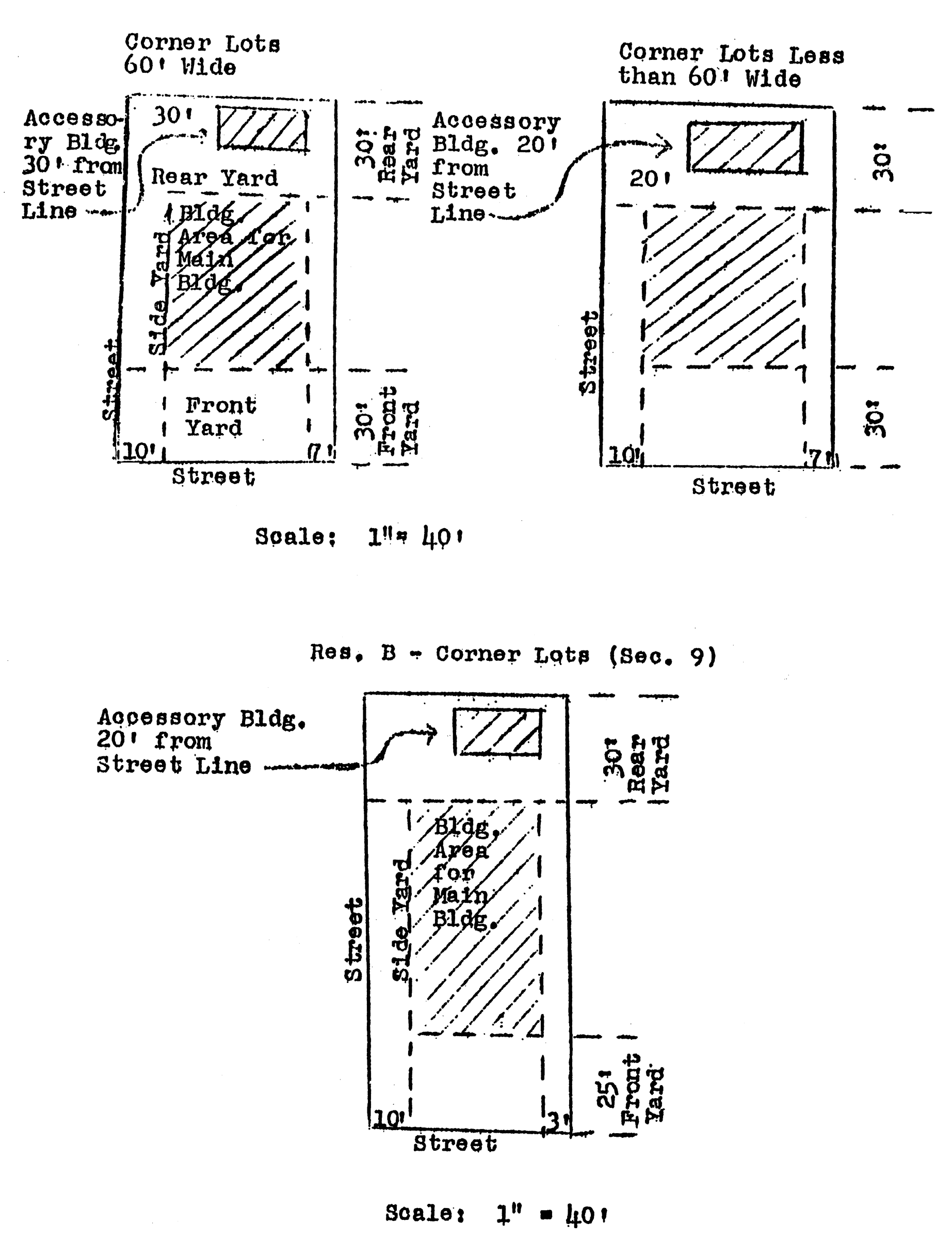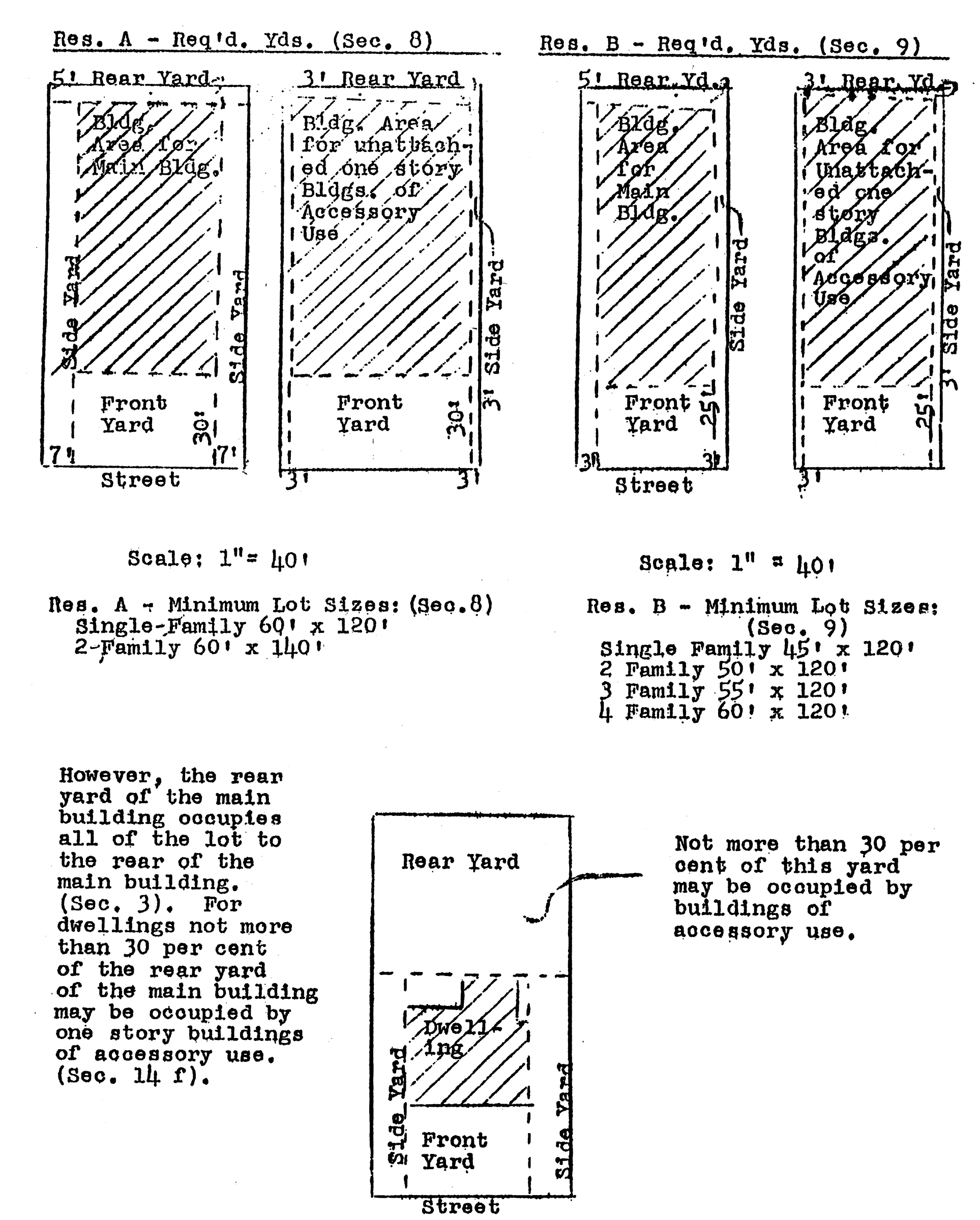 | Local business: Uses in residence B plus apartments, grocery & drug stores, theaters, filling stations, etc. | 35 - 2½ | 30' | For dwellings, same as Residence B | Front yard required for parking. For places of public assembly, hotels & office building—spaces as required by Town council. | ||||