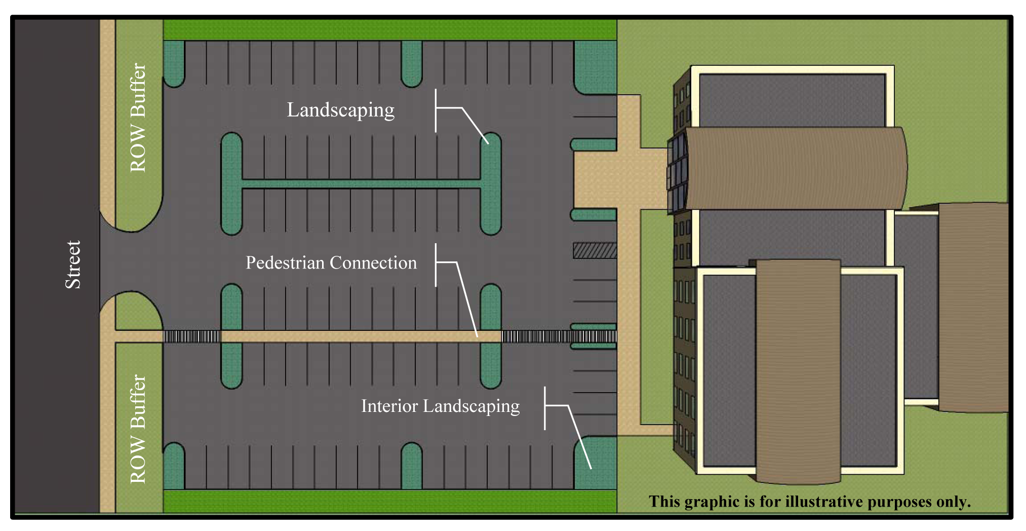 Landscaping and pedestrian connections. Off-street parking areas shall comply with all applicable DCSM requirements as well as the following requirements for parking bays and landscaped islands.