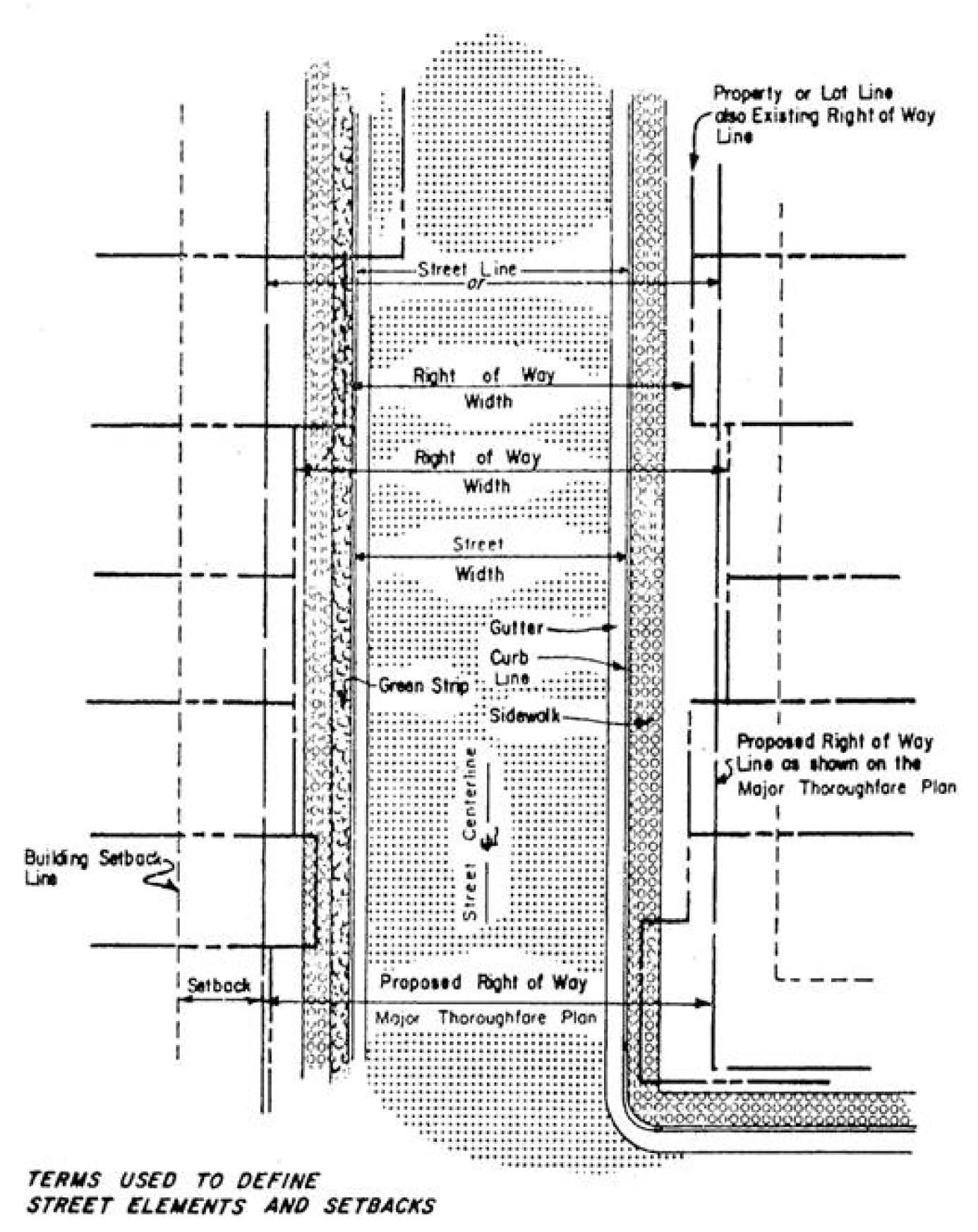 Street width: The total width of the strip of land (right-of-way) dedicated or reserved for public travel, including roadway, curbs, gutters, sidewalks, and planting strips. See Illustration 4 at end of this section.