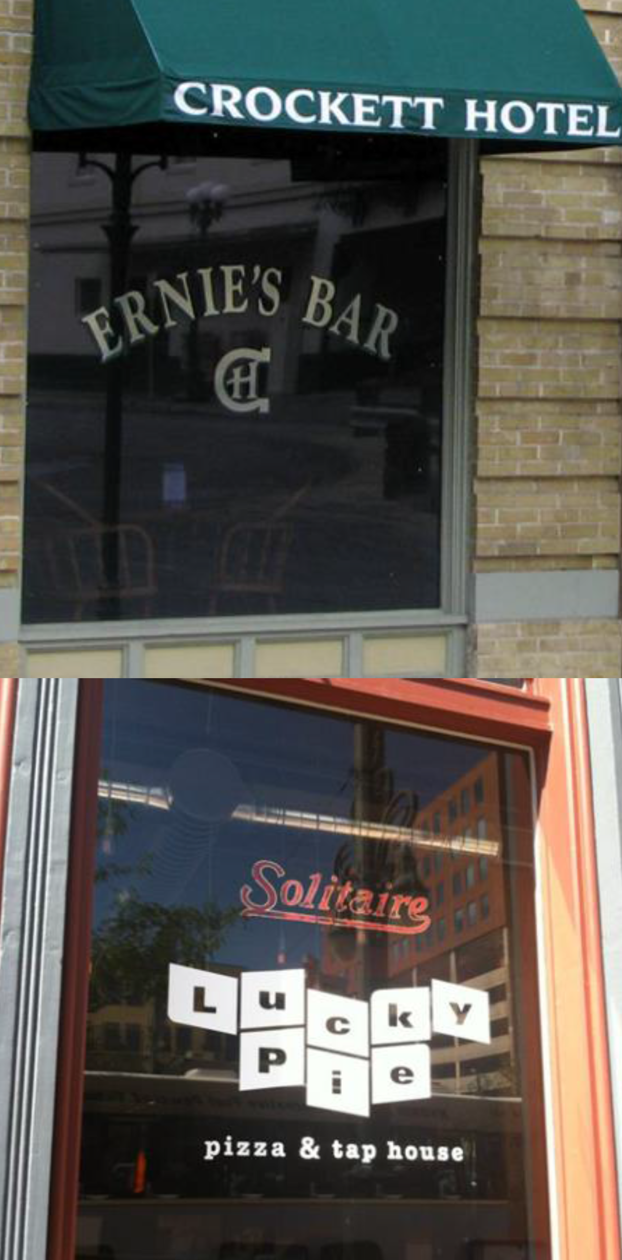 Etched signs in windows, above a door, or integral to an architectural component of a building.