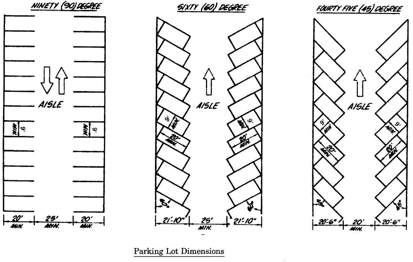 The following illustrations are hereby made a part of this Ordinance and are designed solely to illustrate the requirements for aisles in off-street parking areas as regulated in Section 16.