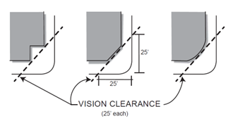 Buildings located at the intersection of two public streets shall not extend into the vehicular vision clearance area as defined in Section 18.02.1.4.