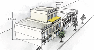 Buildings shall include a step back of a minimum of ten (10) feet for the portion of building that extends beyond twenty-eight (28) feet in height.