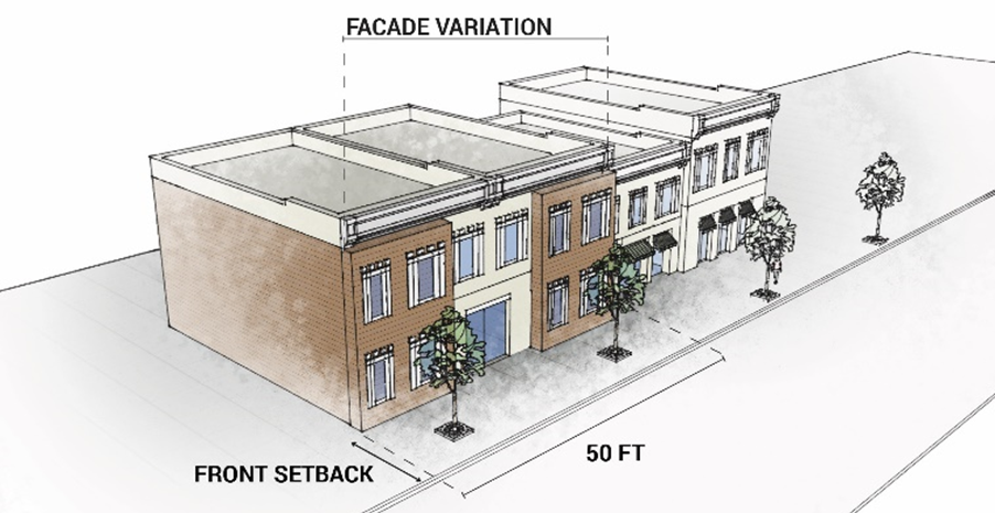 Building façades over fifty (50) feet in length shall vary the front façade by a horizontal dimension of at least five (5) feet such that no more than sixty percent (60%) of the façade extends to the maximum extent of the setback.