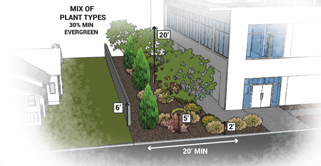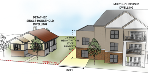 Multi-household and commercial structures shall not exceed a height of twenty-eight (28) feet within twenty (20) feet of the side and rear property lines adjacent to an existing single-household unit.