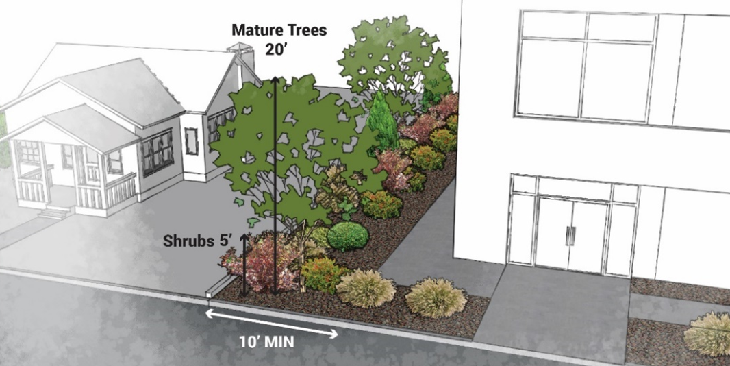 The rear yard setback shall be landscaped in native plant material to blend with the natural ecosystems of the creek.