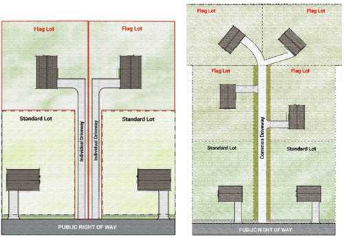 Individual driveways may be used by two lots, however where three or more flag lot stems front on a public right-of-way or private roadway side by side, a common driveway shall be used.