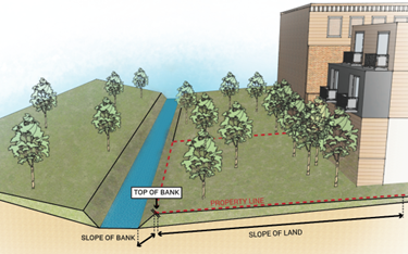 Top of bank - the break in slope between the creek bank and surrounding terrain. The top of bank represents the boundary where normal water flow takes place including the active channel, active floodplain, and their associated banks.