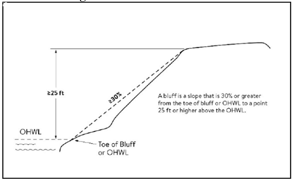The grade of the slope from the toe of the bluff to a point 25 feet or more above the ordinary high water level averages 30 percent or greater (see Figure 1), except that an area with an average slope of less than 18 percent over a distance of at least 50 feet shall not be considered part of the bluff (see Figure 2).