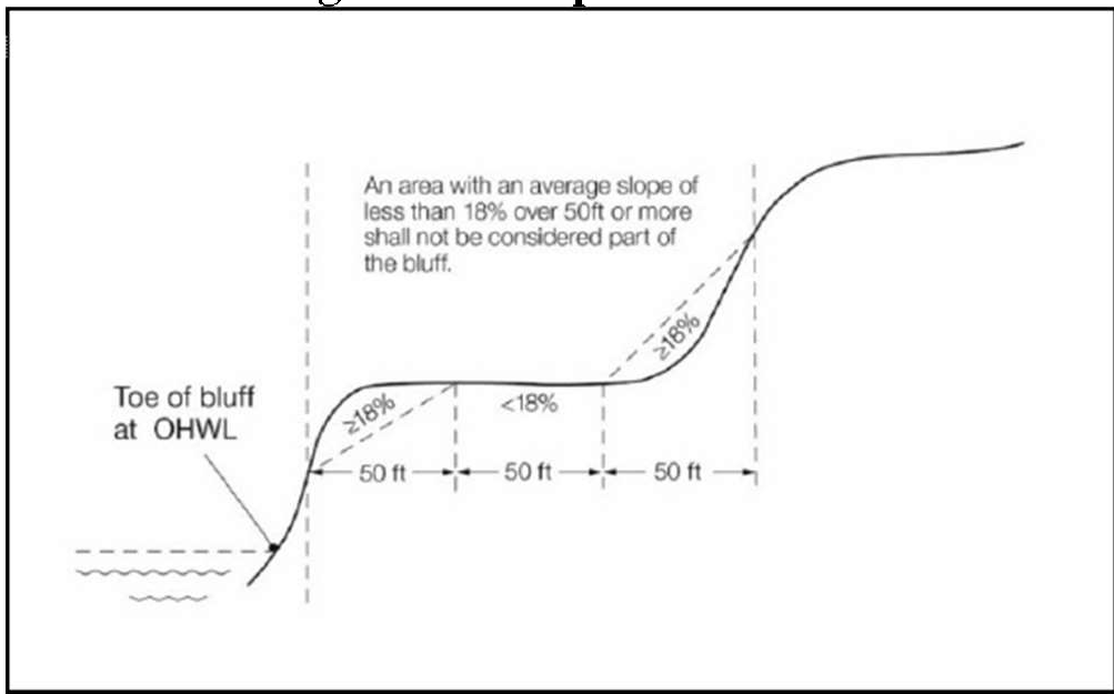 Bluff, top of, means for the purposes of measuring setbacks, bluff impact zone, and administering vegetation management standards, the higher point of a 50-foot segment with an average slope exceeding 18 percent. See Figure 3.