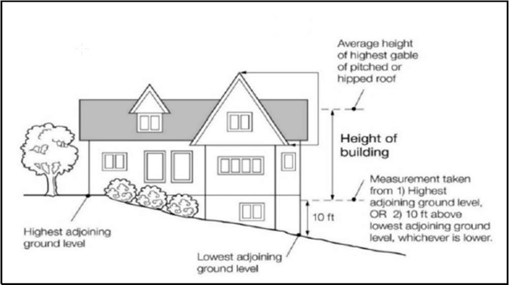 Height of building means the vertical distance between the highest adjoining ground level at the building or ten feet above the lowest adjoining ground level, whichever is lower, and the highest point of a flat roof or average height of the highest gable of a pitched or hipped roof (see Figure 4).