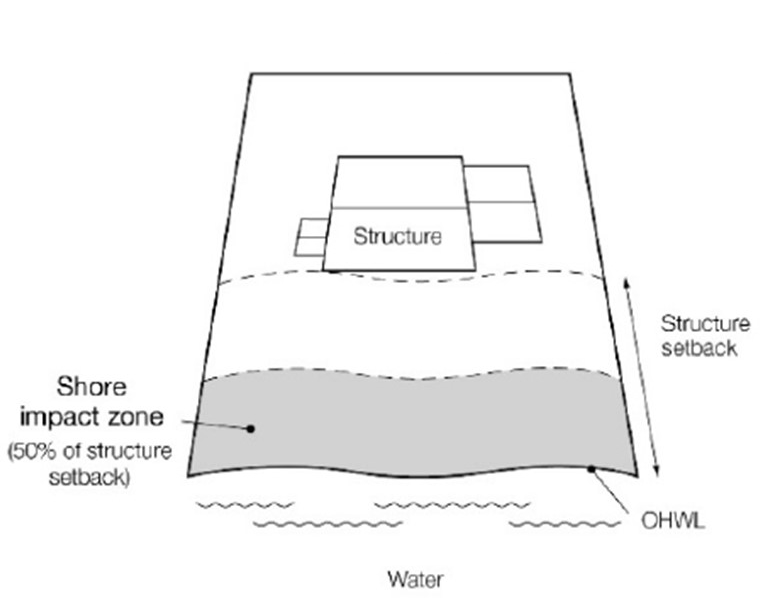 Shore impact zone means land located between the ordinary high water level of a public water and a line parallel to it at a setback of 50 percent of the structure setback (see Figure 6).