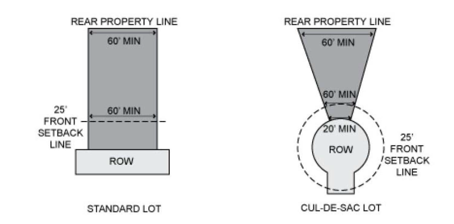 Minimum lot width for a cul-de-sac lot is 20 feet measured at the street edge and 60 feet measured at the setback line.