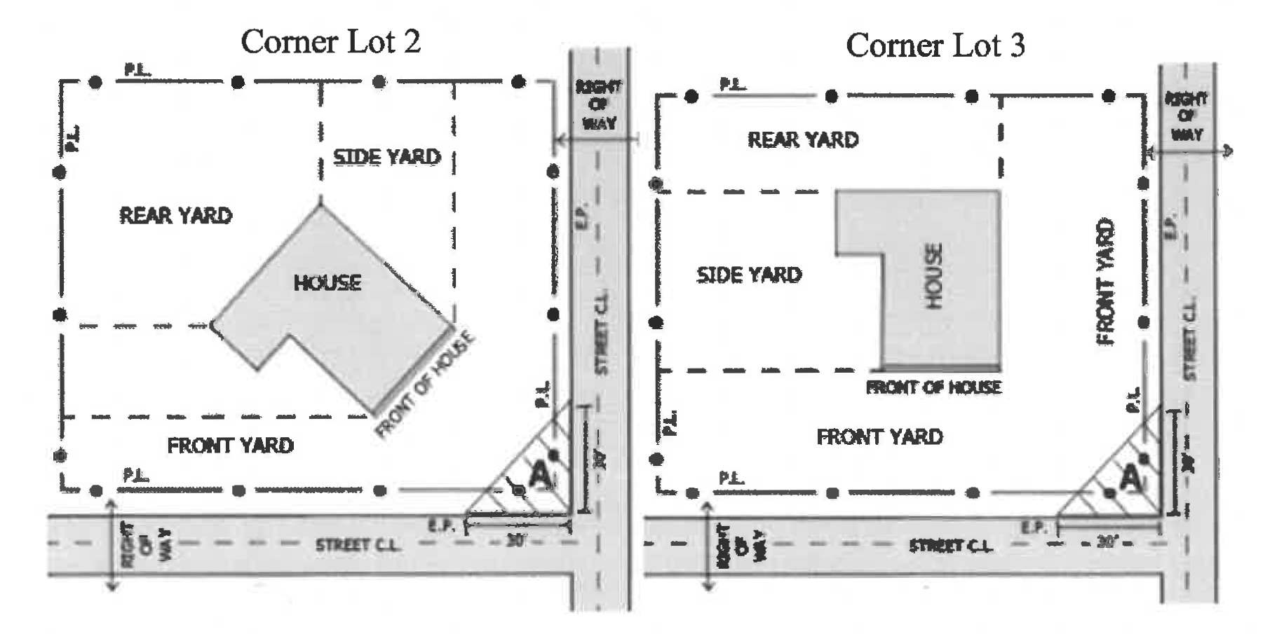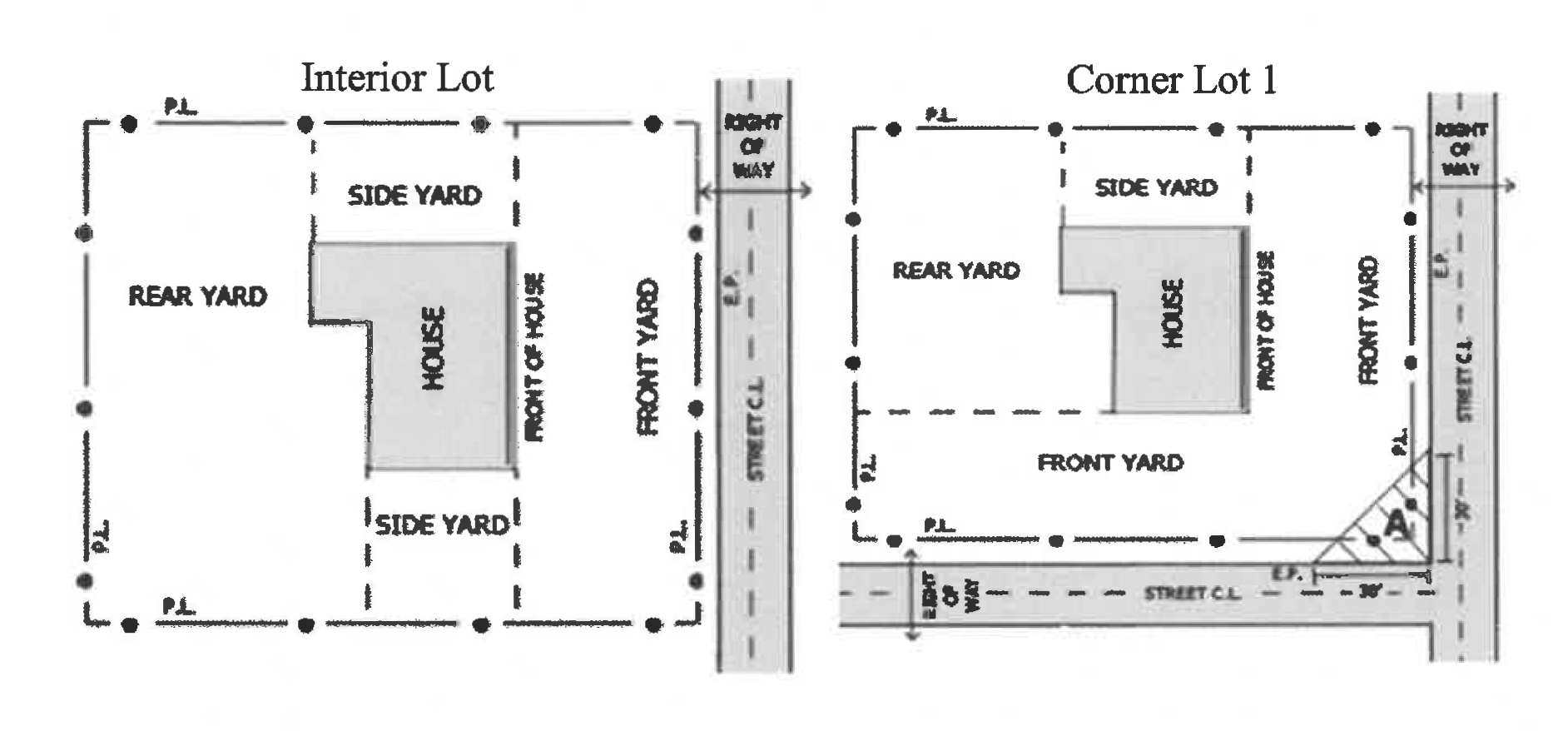 Swimming pools or spas, are not allowed in the front or side yard. If you are on a corner lot both street sides are considered front yards, see Interior and Corner Lot diagrams.