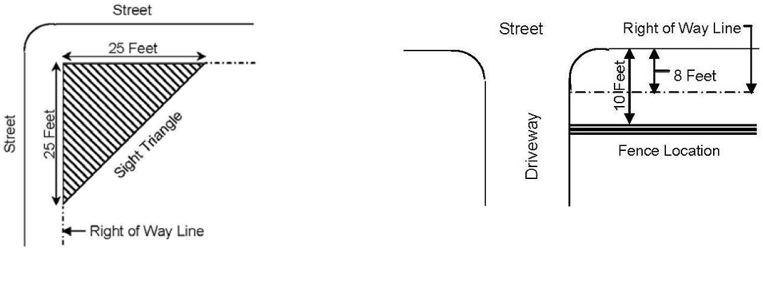 Driveway visibility. Fences and landscape structures shall be set back a minimum of ten feet from the curbline or to the edge of the public right-of-way, whichever is greater.