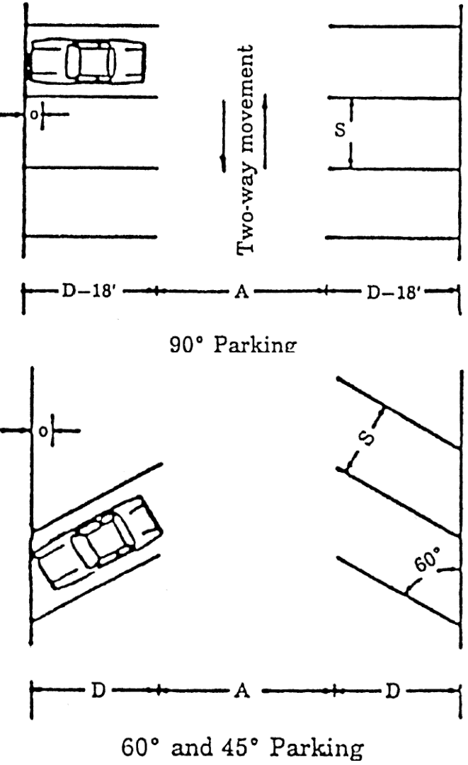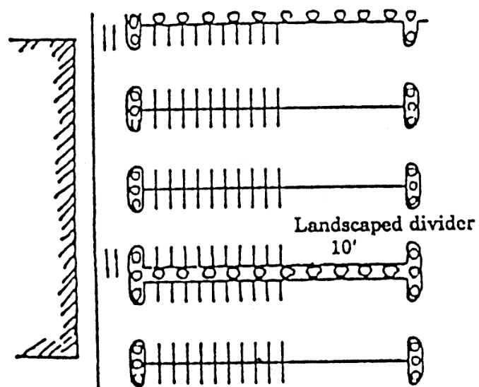 The city may require a ten-foot-wide planter or median strip every three or four parking bays to prevent high speed movement diagonally across the parking lot and to improve esthetics. Refer to Illustration 44-17-B: