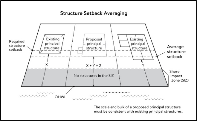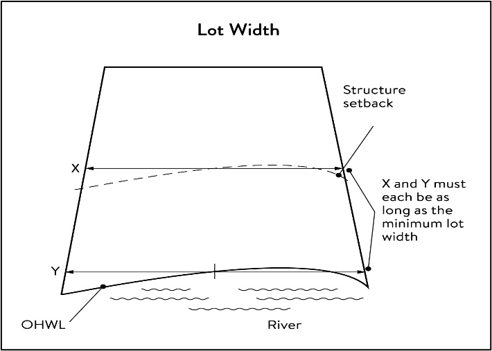 Lot width means the shortest distance between lot lines measured at both the ordinary high water level and at the required structure setback from the ordinary high water level. See Figure 3.