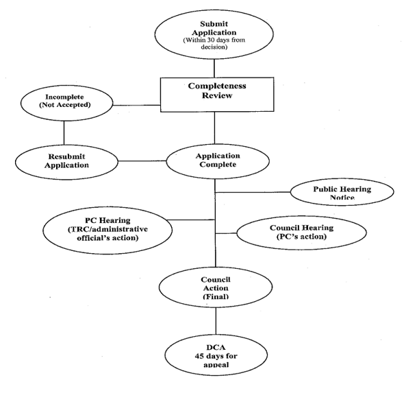 Certain development approvals or activities shall not require a site plan approval by the PC, TRC or Council. Applicants for these permits or activities may apply to the specific department having authority to grant an administrative development approval. Application types requiring only an administrative approval are as follows: Home occupation uses, alcohol beverage license, site plan development approval of up to three (3) residential dwelling units, vacation rental license, building permits, minor amendments to an existing conditional use permit, long dock variances, administrative variances, certificate of compliance, sign permit, temporary placement permit, temporary use permit and tree removal permit.
