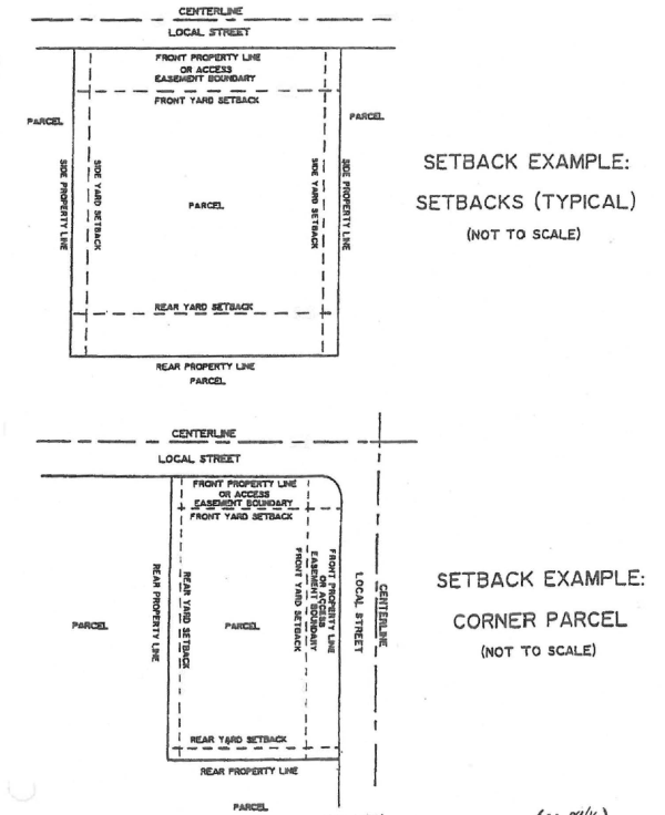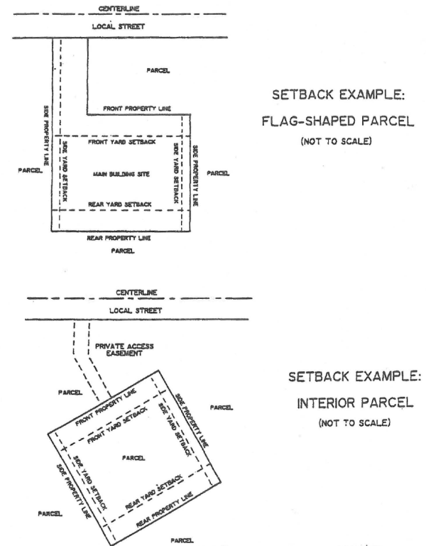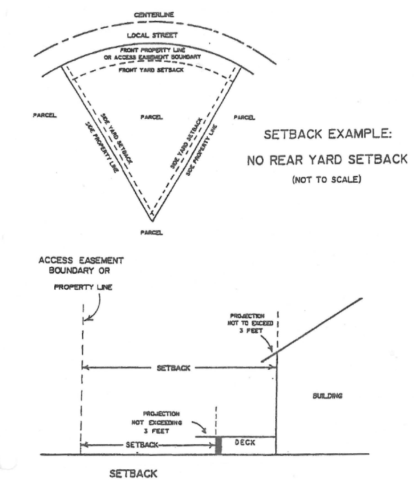 Setback: The required minimum horizontal distance between a property line, edge of access easement, and street centerline and the nearest vertical structural support or wall of a building or structure or the nearest edge of a use. (Ord. 862 Sec. I, 1993).