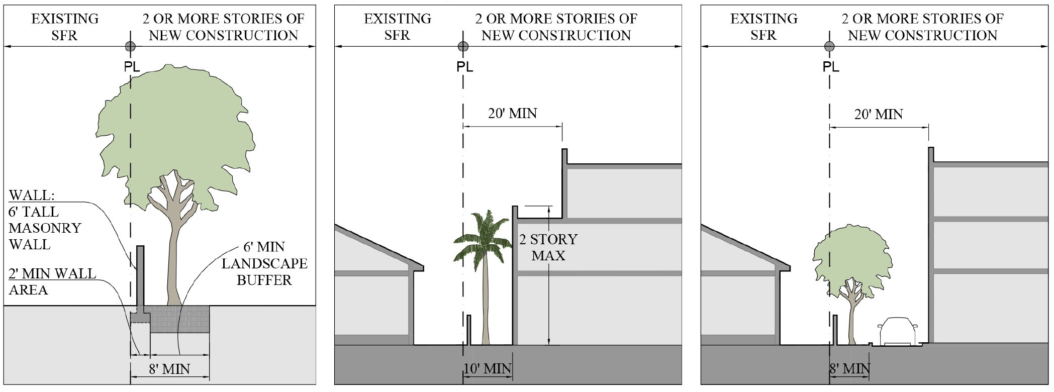 If a vehicular use area abuts a residential property (existing residential use or Multifamily Subdistrict) that is not a part of the subject development, a landscaped buffer, eight-feet wide shall be provided. Trees with a minimum height of 16 feet, with a four-foot clear trunk, and four-inch dbh shall be planted at a maximum of 30-foot intervals. If palms are used, each palm must have a 12-foot minimum clear trunk and be planted at a maximum of 15-foot intervals.